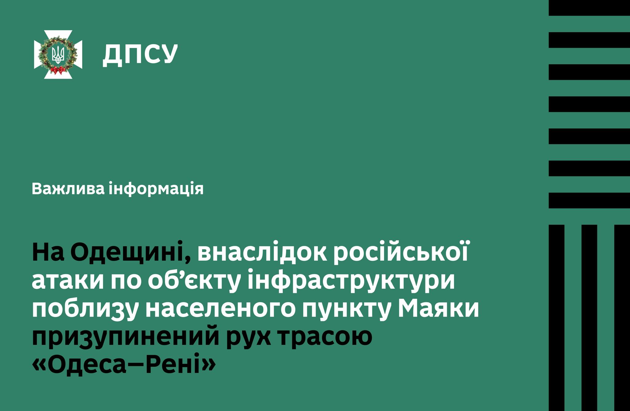 ‼️ Унаслідок російської атаки по об’єкту інфраструктури поблизу н.п. Маяки призупинено рух трасою Одеса–Рені, що ускладнило доїзд до низки пунктів пропуску на Одещині: