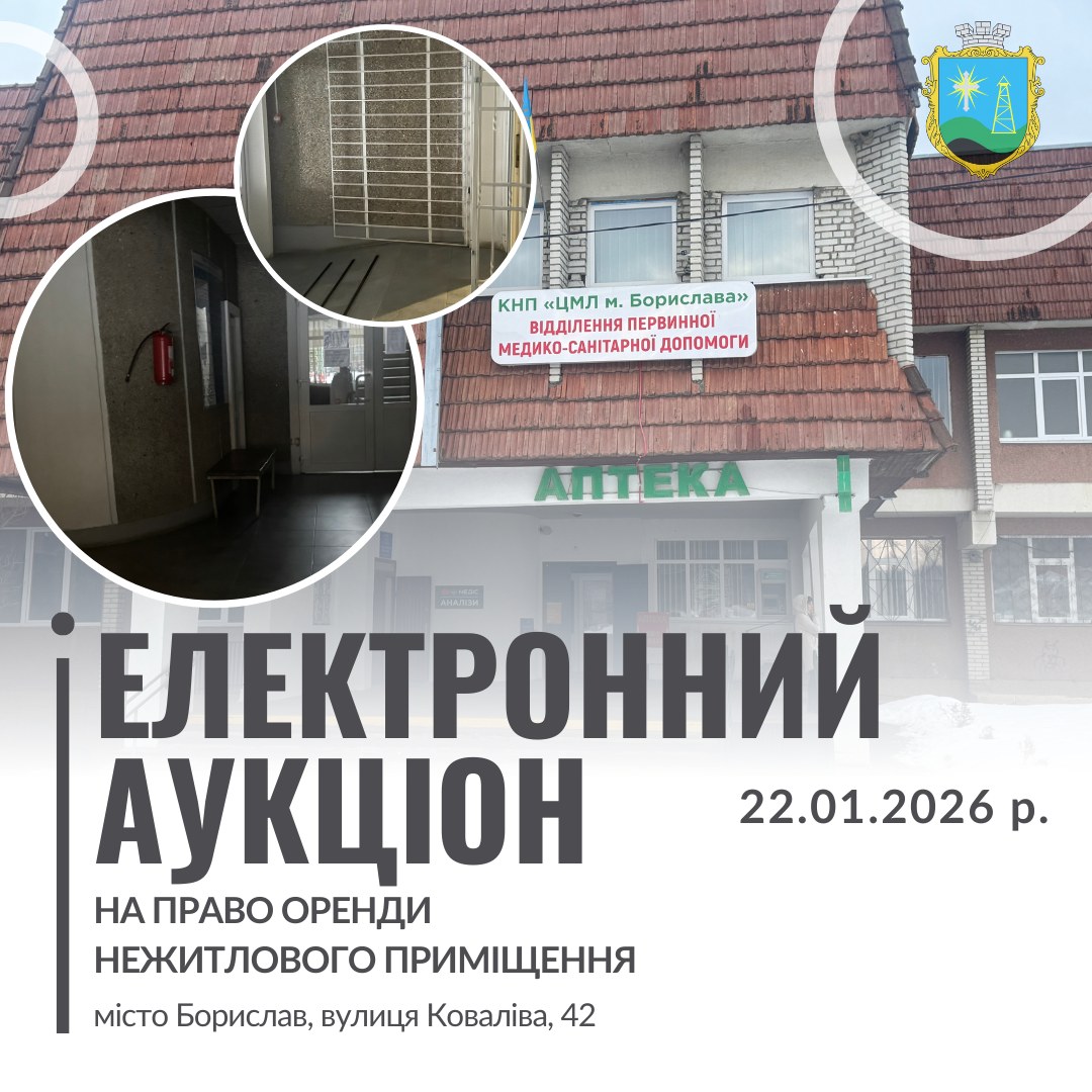 📢 Управління комунальної власності, земельних відносин та архітектури Бориславської міської ради повідомляє про проведення 22.01.2026 року електронного аукціону на право оренди частини приміщення, загальною площею 2,0 кв. м, розташованого на 1-му поверсі нежитлової будівлі (відділення первинної медико-санітарної допомоги комунального некомерційного підприємства “Центральна міська лікарня м. Борислава” Бориславської міської ради), за адресою: Львівська область, Дрогобицький район, місто Борислав, вулиця Ковалів, будинок 42, для розміщення кав’ярні самообслуговування.