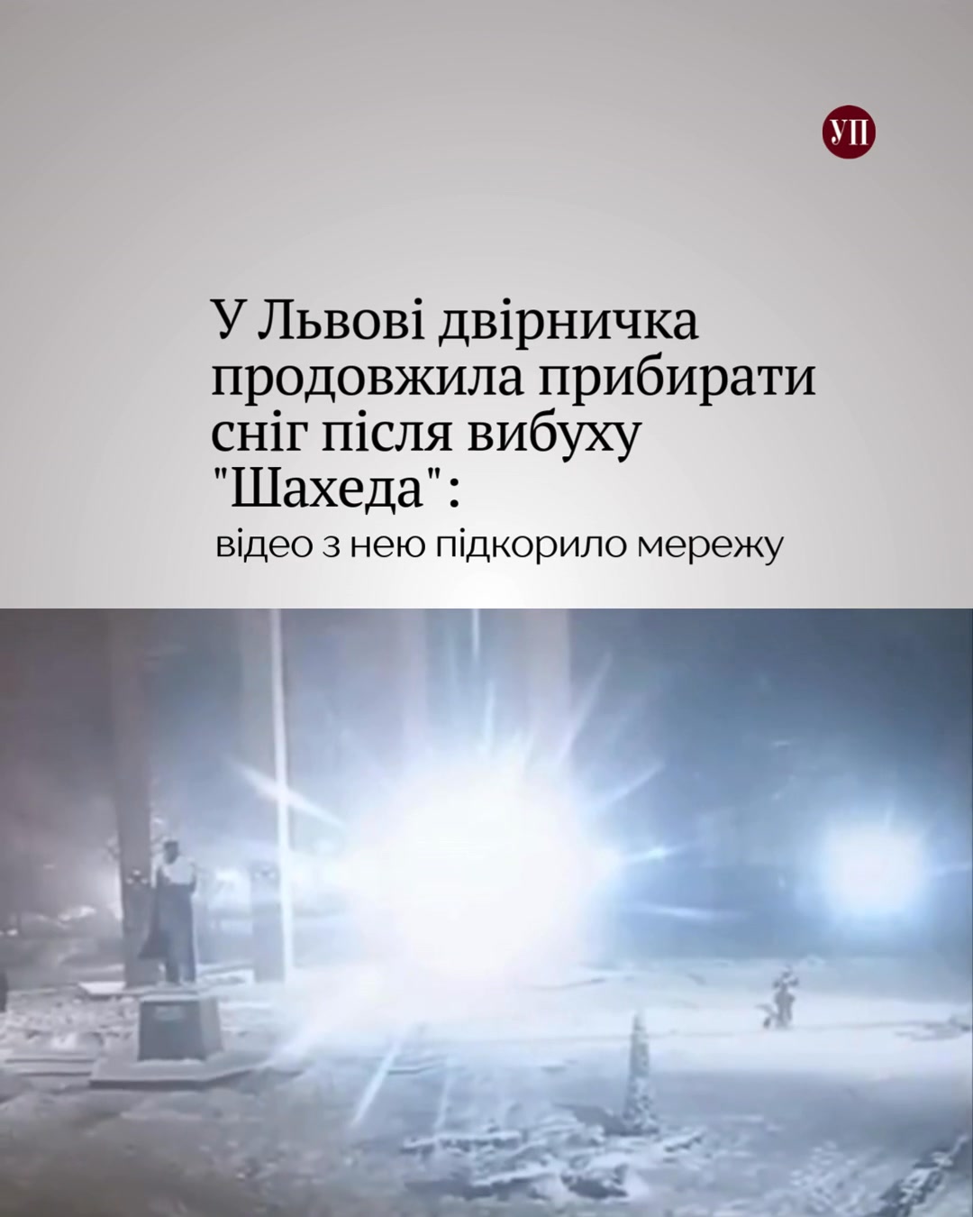 Уранці російський безпілотник впав і вибухнув на дитячому майданчику біля пам’ятника Степану Бандері у Львові — у цей час там працювали комунальники, зокрема двірничка пані Ольга. Одразу після детонації “Шахеда” жінка продовжила прибирати сніг.