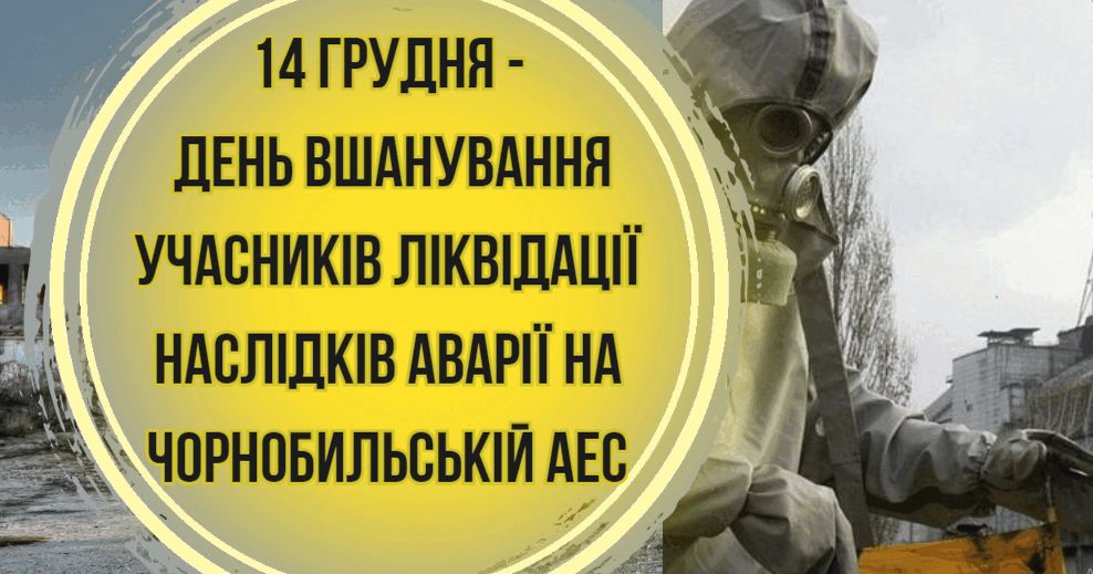 14 грудня в Україні вшановують День ліквідаторів наслідків аварії на Чорнобильській АЕС – людей, які ціною свого життя і здоров’я змогли здолати страшну трагедію, що сталась 26 квітня 1986 року на Чорнобильській АЕС. Ця пам’ятна дата була затверджена указом Президента України 10 листопада 2006 року.