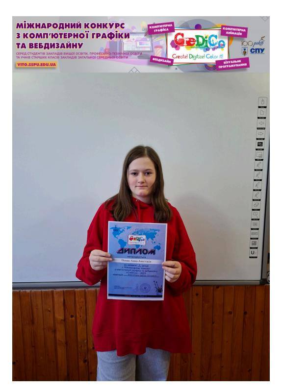 З гордістю повідомляємо: наша талановита учениця 9-А класу Попик Анна-Анастасія здобула 3 місце 🥉 серед учасників з різних країн світу в номінації 3D-графіка!