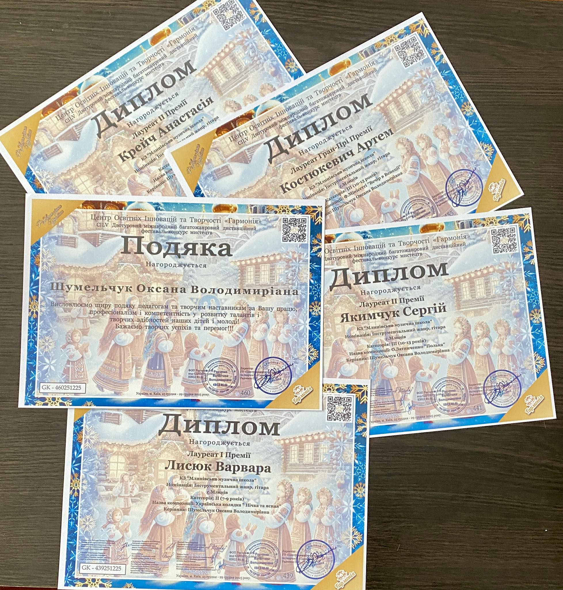 класу викладача Шумельчук Оксани Володимирівни/ Оксана Шумельчук здобули перемоги у Двотуровому міжнародному багатожанровому дистанційному фестивалі – конкурсі мистецтв «Рідвяна зірка України» у номінації «Інструментальний жанр, гітара» та отримали: