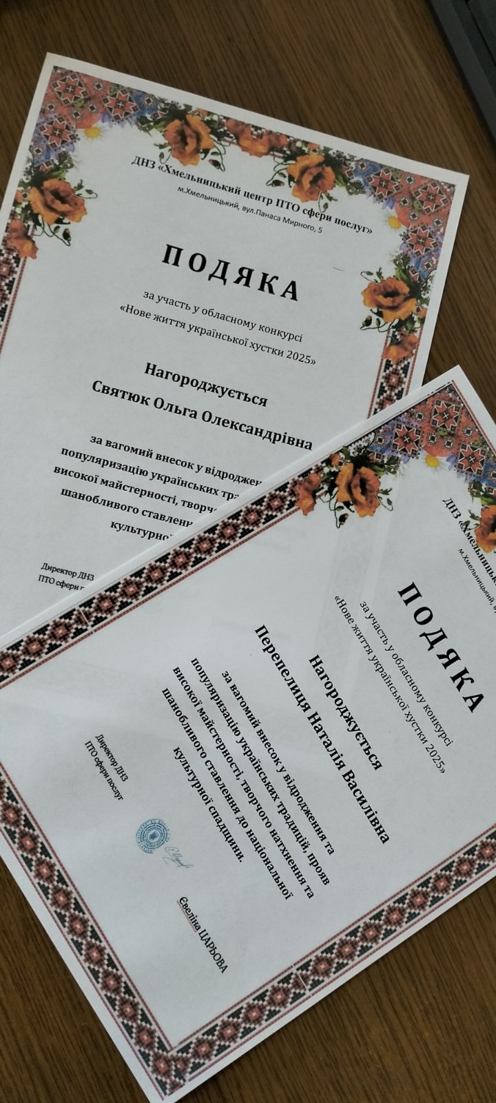 Дівчатка отримали **Подяки** Хмельницького центру ПТО сфери послуг за вагомий внесок у відродження та популяризацію українських традицій, прояв високої майстерності, творчого натхнення та шанобливого ставлення до національної культурної спадщини.