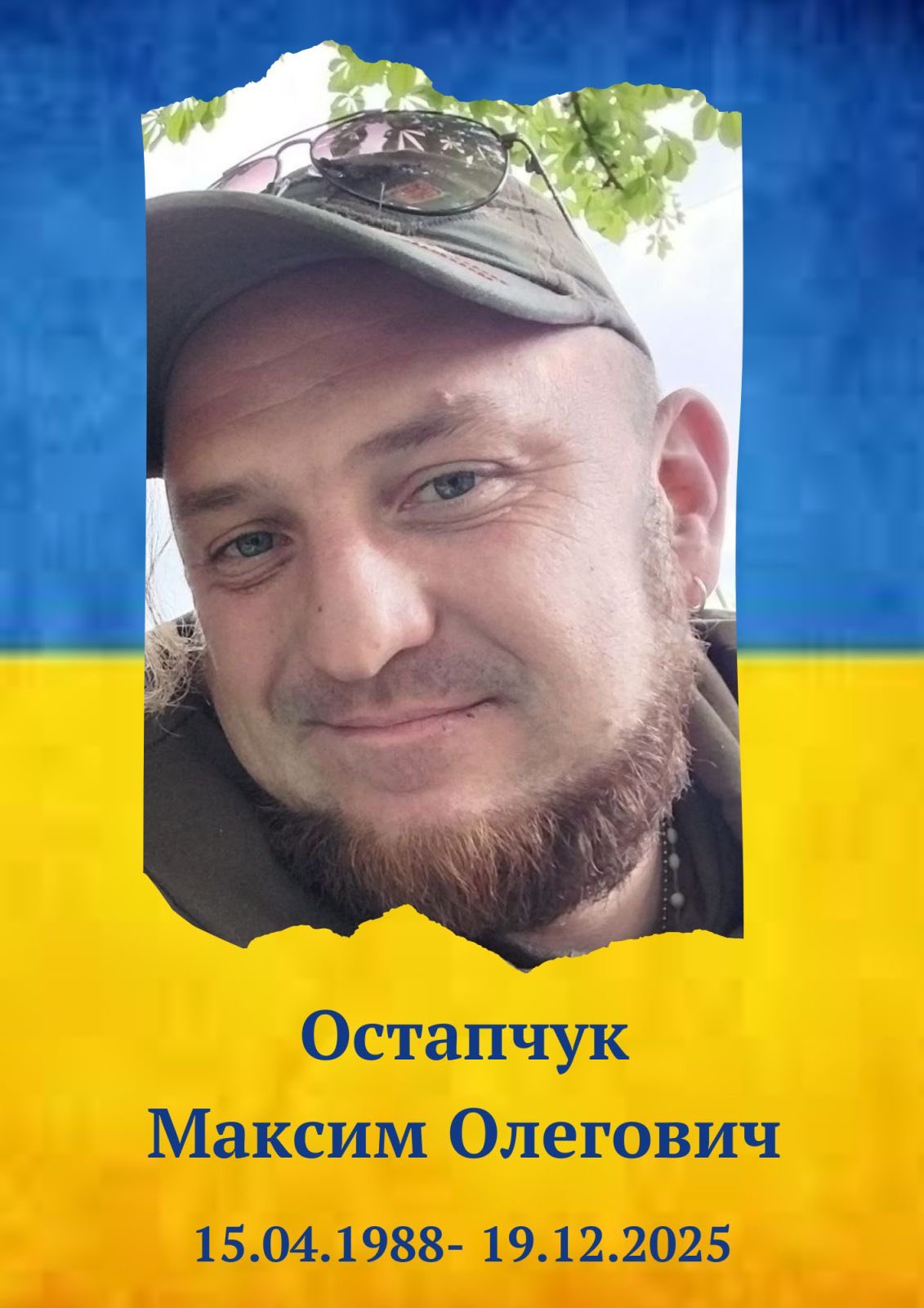 Максим Олегович – старший стрілець-вогнеметник гірсько-штурмового взводу гірсько-штурмової роти гірсько-штурмового батальйону однієї з військових частин, старший солдат, відданий Військовій присязі на вірність Українському народу, мужньо виконавши військовий обов’язок, в бою за Україну, її свободу і незалежність, загинув 19 грудня 2025 року в районі одного з населених пунктів Запорізької області. Відважний хоробрий Воїн, вірний побратим, Його поважали за розсудливість, товариськість, добру вдачу та вміння вчасно прийти на допомогу ближньому. Остапчук М.О. за мир в Україні, за кожного з нас віддав найдорожче – своє життя.