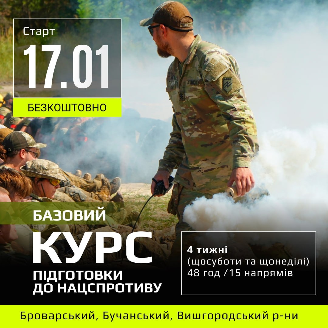 📅 Безкоштовний 4-тижневий курс стартує 17 січня в Київському обласному центрі підготовки населення до національного спротиву. Долучитися може кожен охочий від 18 років. Також у центрі чекають студентів для проходження обов’язкової підготовки.