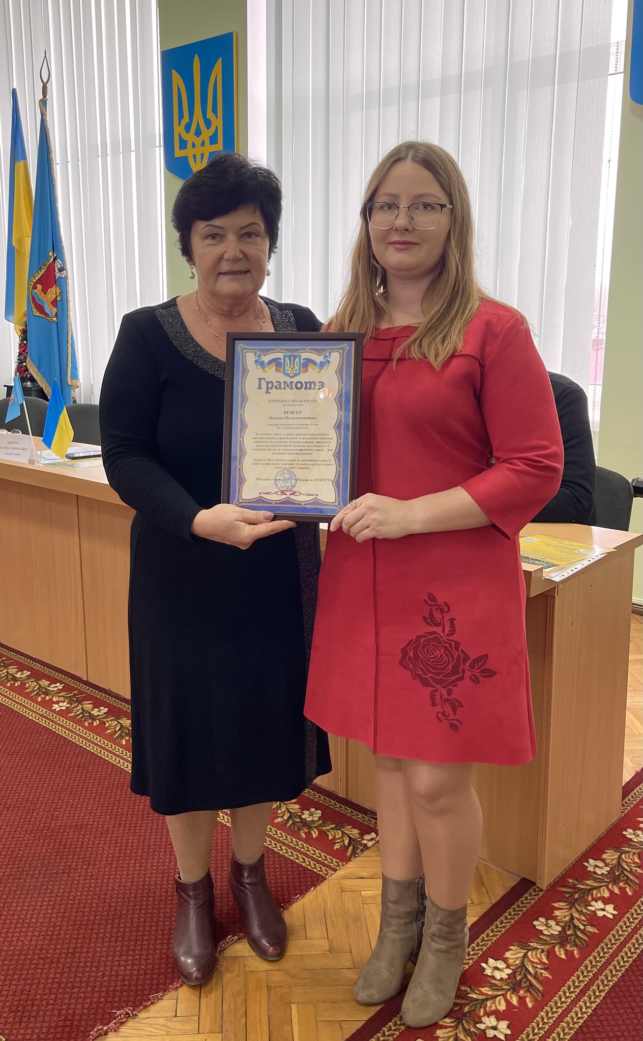 Перед початком заходу вона вручила грамоту Оксані Венгер — активній учасниці робочої групи з підготовки проєкту Статуту, голові ГО «Горлиця Корчеська», заступниці голови Молодіжної ради при Корецькій міській раді та членкині виконавчого комітету.
