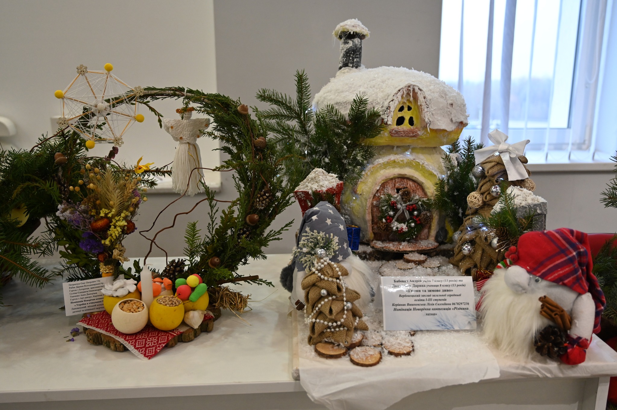 🏆 у номінації «Новорічна композиція «Різдвяна казка» – Швігар Ангеліна, учениця 8-Б класу Лановецького закладу загальної середньої освіти І-ІІІ ступенів № 2 (композиція «Різдвяне колесо бажань», керівник Лариса Васюрина)