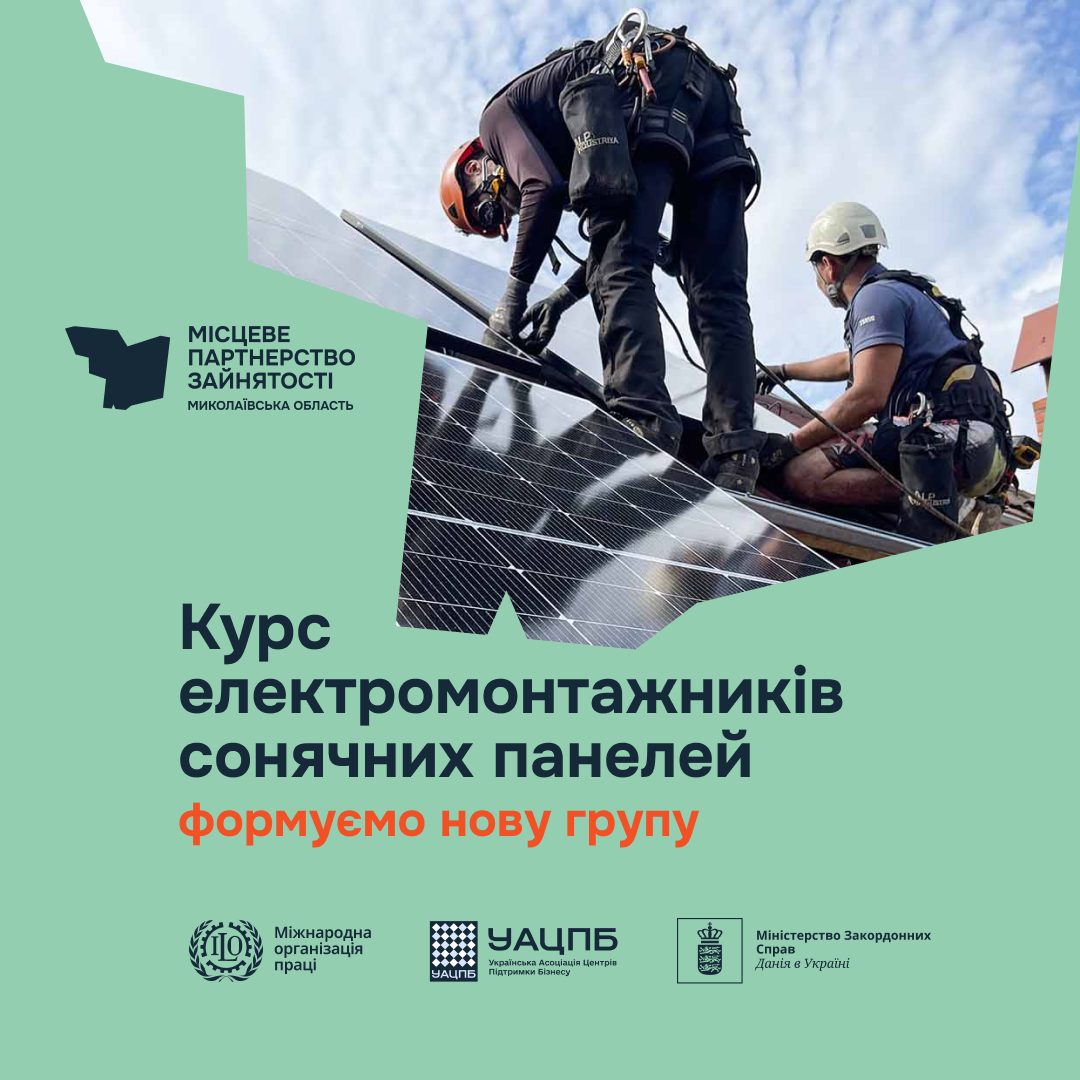 Місцеве партнерство зайнятості у Миколаївській області оголошує набір другої групи на короткостроковий курс за професією «Електромонтажник з освітлення та освітлювальних мереж» (часткова професійна кваліфікація «Обслуговування відновлювальних джерел енергії (сонячна енергетика)»).