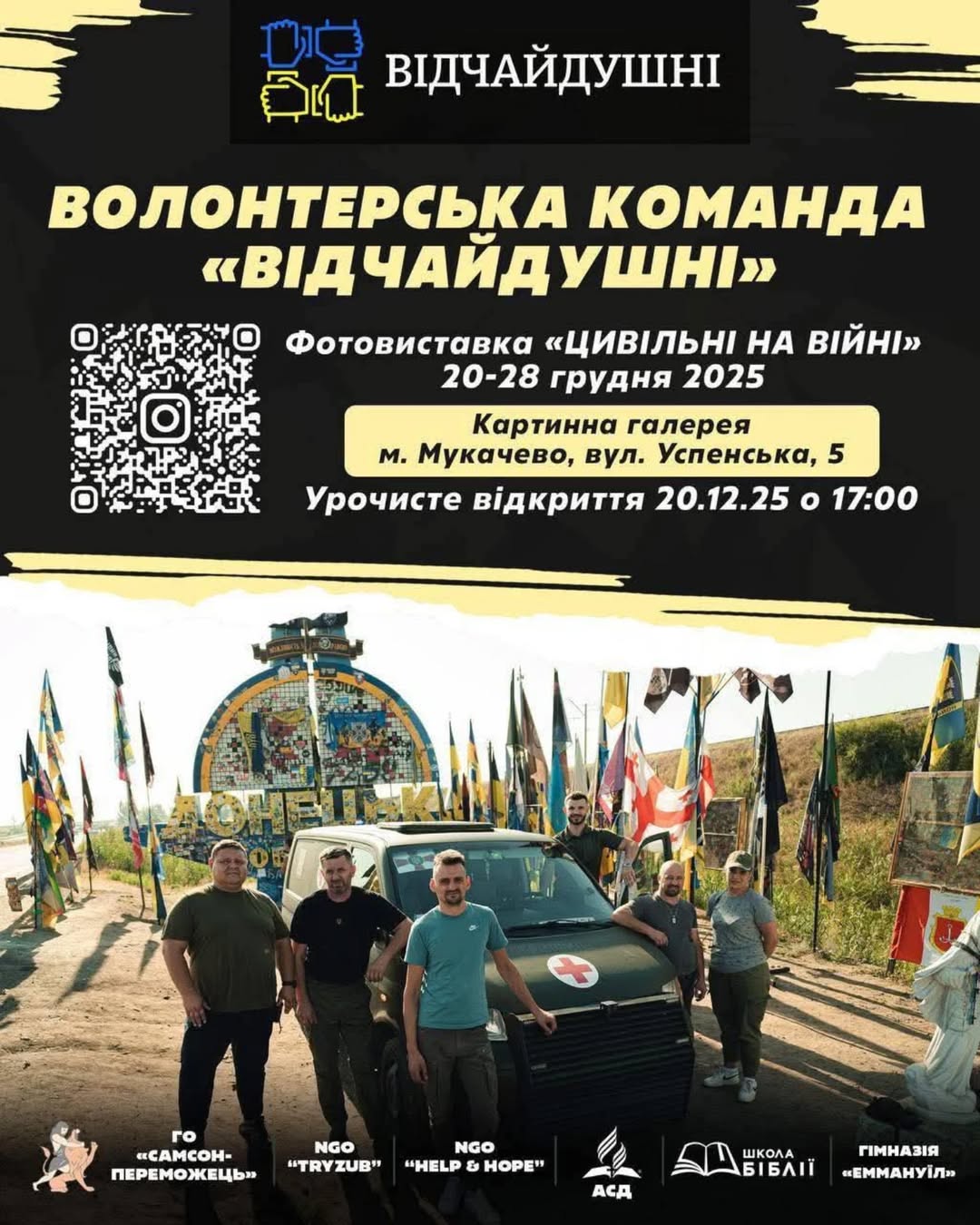 ✅Волонтерська команда «Відчайдушні» організовує показ фотовиставки «Цивільні на війні». Виставка експонуватиметься у Мукачівській картинній галереї з 20 по 28 грудня.