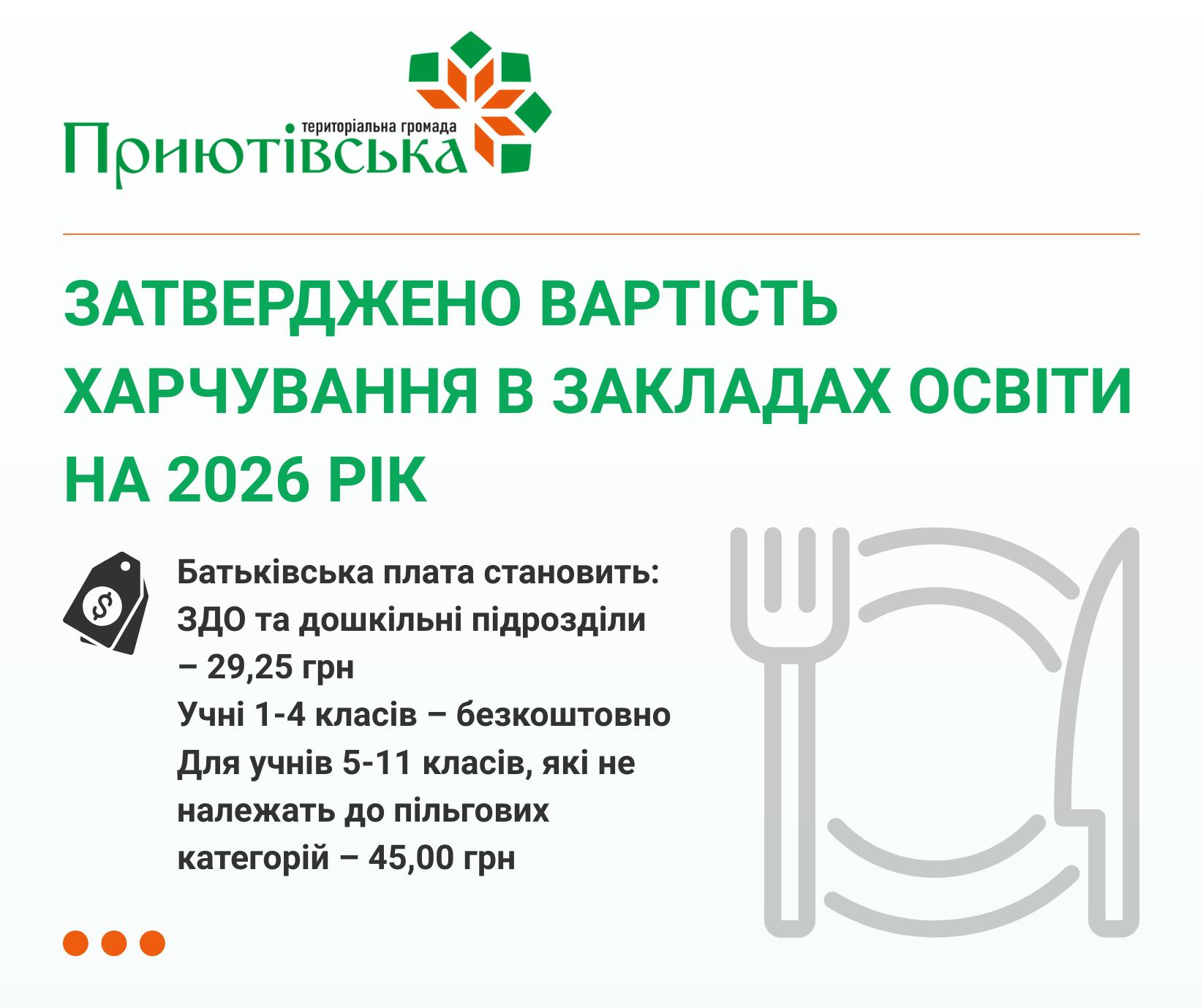 У Приютівській громаді затвердили вартість харчування в закладах дошкільної та загальної середньої освіти на 2026 рік.