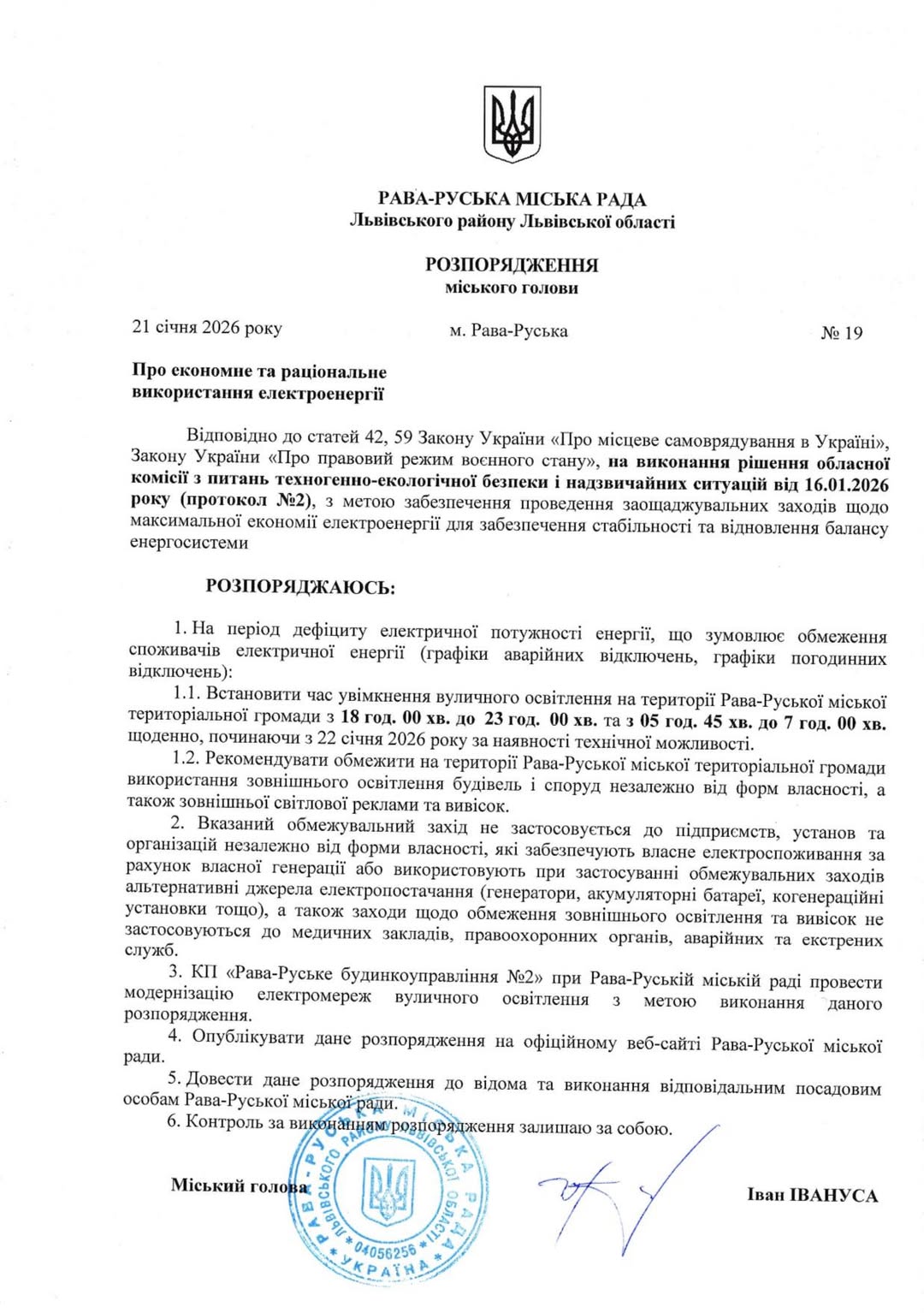 📝Відповідно до розпорядження міського голови № 19 від 21 січня 2026 року «Про економне та раціональне використання електроенергії», на території громади змінюється режим роботи зовнішнього освітлення з метою раціонального використання електроенергії.