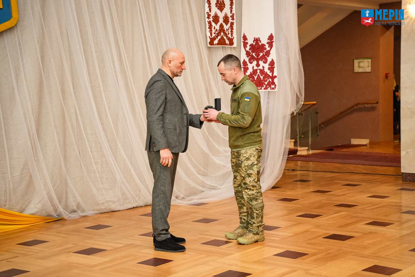З нагоди Дня Соборності України Черкаський міський голова Анатолій Бондаренко вручив пам’ятну відзнаку «За звитяги в ім’я Черкас. Остафій Дашкович» ІІ ступеня, нагрудні знаки «За мужність і героїзм», медалі «Незламній духом Черкащанці», цінні подарунки міського голови, військовим, волонтерам, незламним черкащанкам, матерям, сестрам і дружинам оборонців.