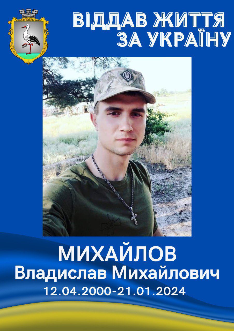 🕯 Владислава Михайловича Михайлова (2000 р.н.) — старшого солдата з міста Дунаївці. Під час виконання бойового завдання на Херсонському напрямку в районі Тягинки він зазнав важкого поранення внаслідок атаки ворожого дрона. Лікарі боролися за нього до останнього, але 21 січня 2024 року серце Героя зупинилося. Йому було всього 23 роки…