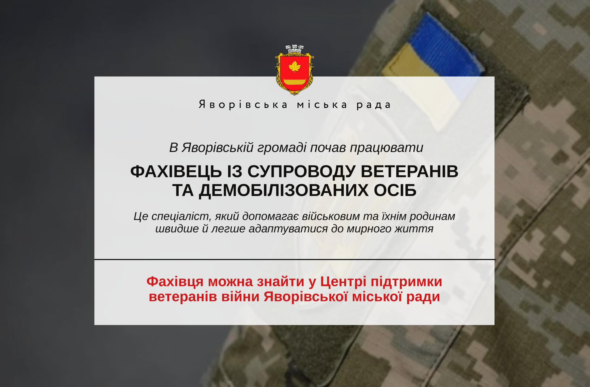 У грудні в Яворівській громаді почав працювати Фахівець із супроводу ветеранів та демобілізованих осіб. Це спеціаліст, який допомагає військовим та їхнім родинам швидше й легше адаптуватися до мирного життя.