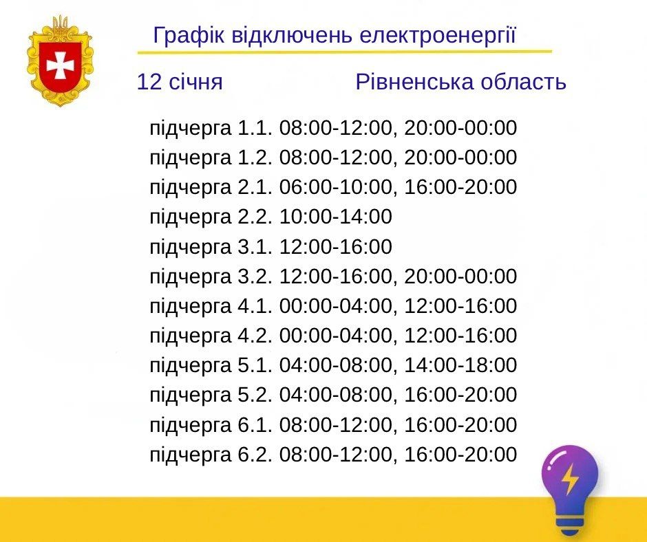 ⚡️ У зв’язку зі складною ситуацією в енергосистемі держави Укренерго дало команду запровадити на Рівненщині у понеділок, 12 січня, графік погодинних відключень електроенергії: