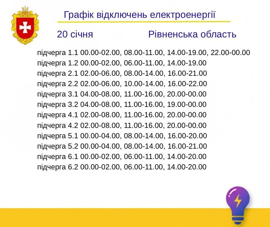 ⚡️ У зв’язку зі складною ситуацією в енергосистемі держави Укренерго дало команду запровадити на Рівненщині у вівторок, 20 січня, графік погодинних відключень електроенергії: