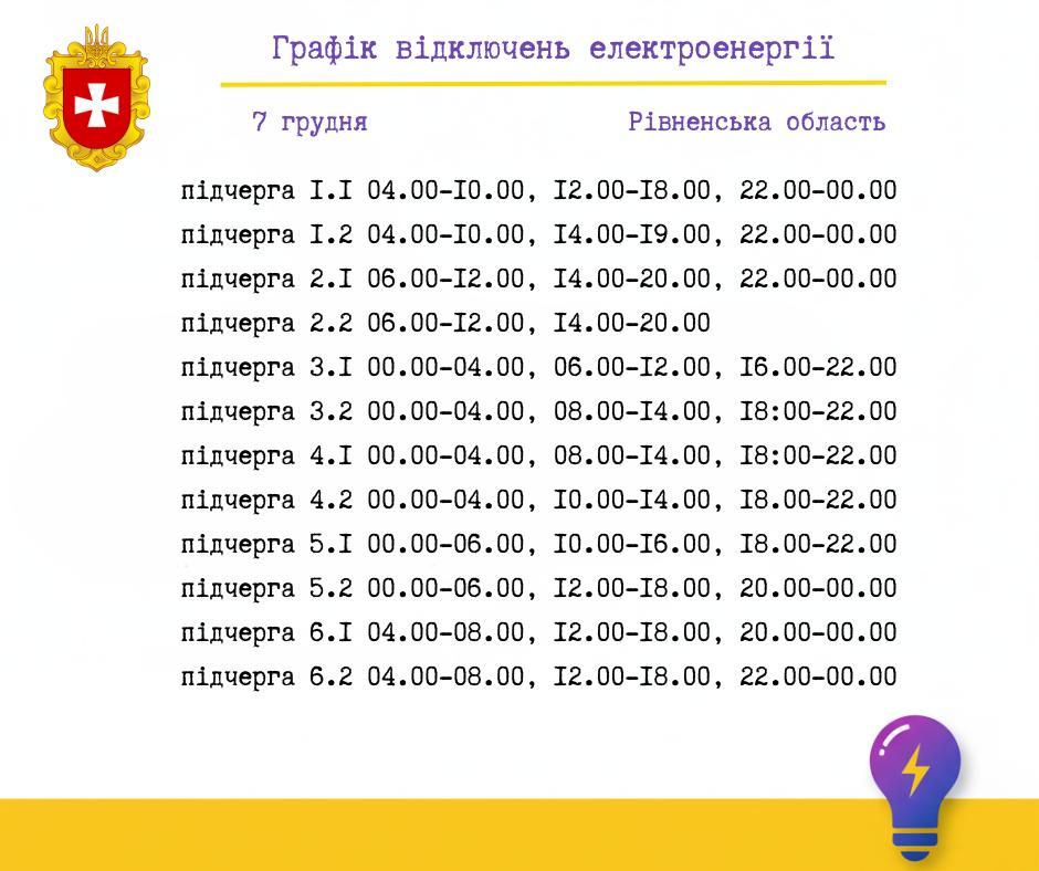 ⚡️ У зв’язку зі складною ситуацією в енергосистемі держави Укренерго дало команду запровадити на Рівненщині у неділю, 7 грудня, графік погодинних відключень електроенергії: