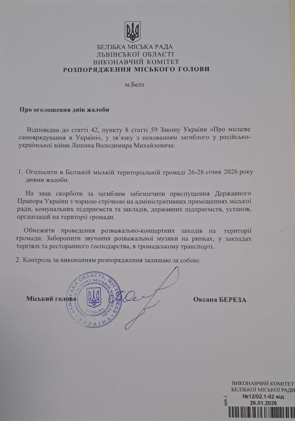 У зв’язку з похованням загиблого у російсько-українській війні захисника України Лешика Володимира Михайловича, згідно з розпорядженням Белзького міського голови, 26–28 січня 2026 року в Белзькій міській територіальній громаді оголошено Дні жалоби.