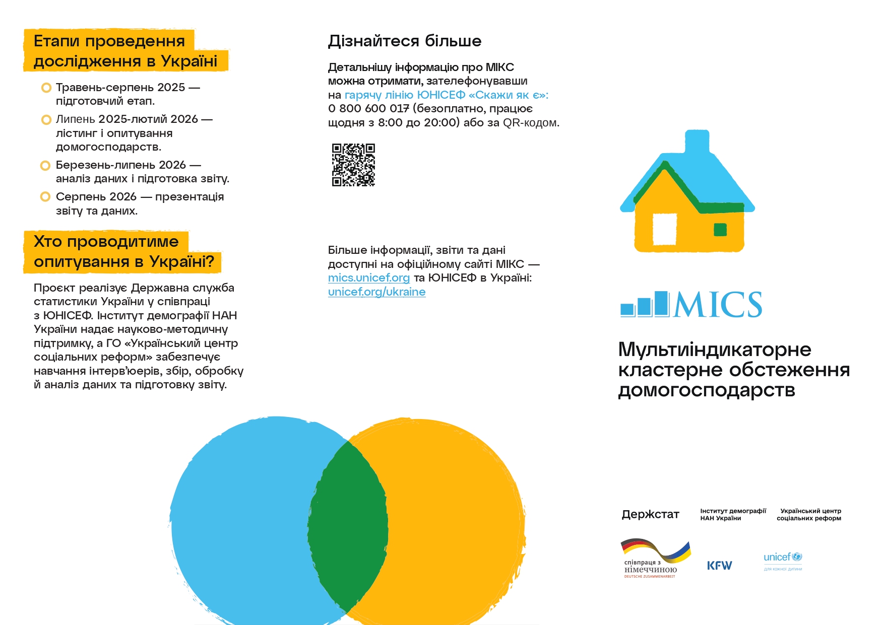 Державна служба статистики України спільно з Інститутом демографії та досліджень якості життя імені Михайла Птухи НАН України та ГО «Український центр соціальних реформ» за підтримки Дитячого фонду ООН (ЮНІСЕФ) в Україні розпочала реалізацію чергового раунду Мультиіндикаторного кластерного обстеження домогосподарств (МІКС). Його проведення передбачається у 2025–2026 роках.
