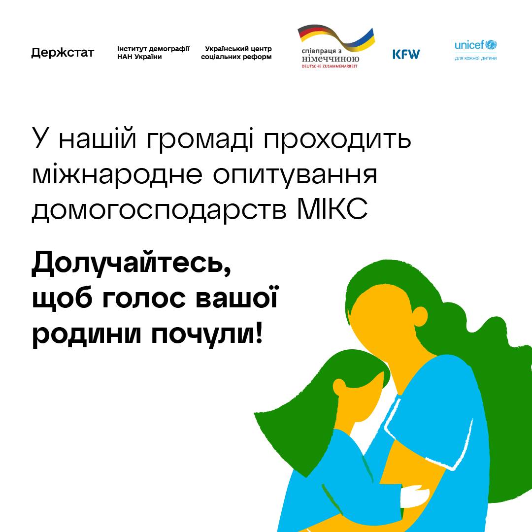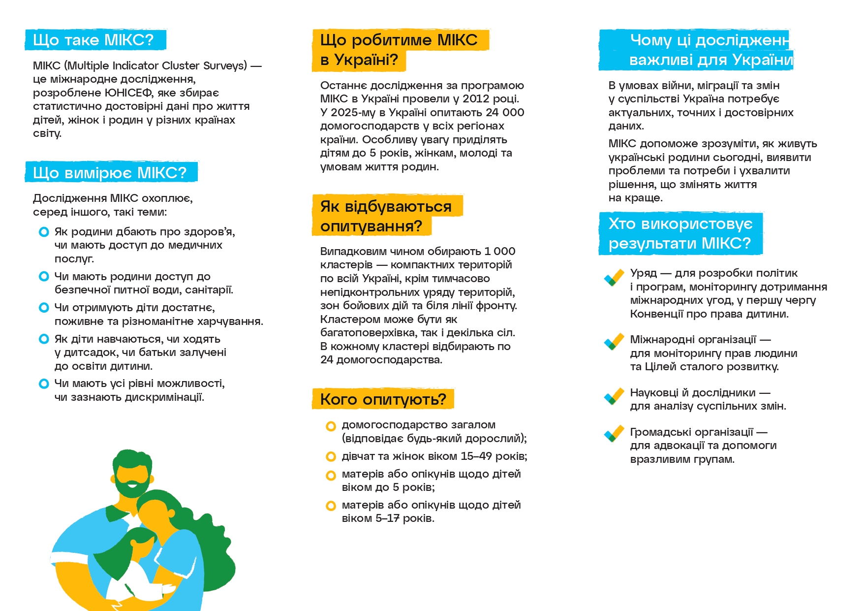 МІКС – це міжнародне вибіркове обстеження, яке дозволяє отримати надійні дані щодо становища дітей та жінок у сферах охорони здоров’я, освіти, харчування, безпеки, водопостачання та санітарії. Зібрана інформація стане підґрунтям для формування більш ефективних державних політик і програм, спрямованих на захист та підтримку сімей.