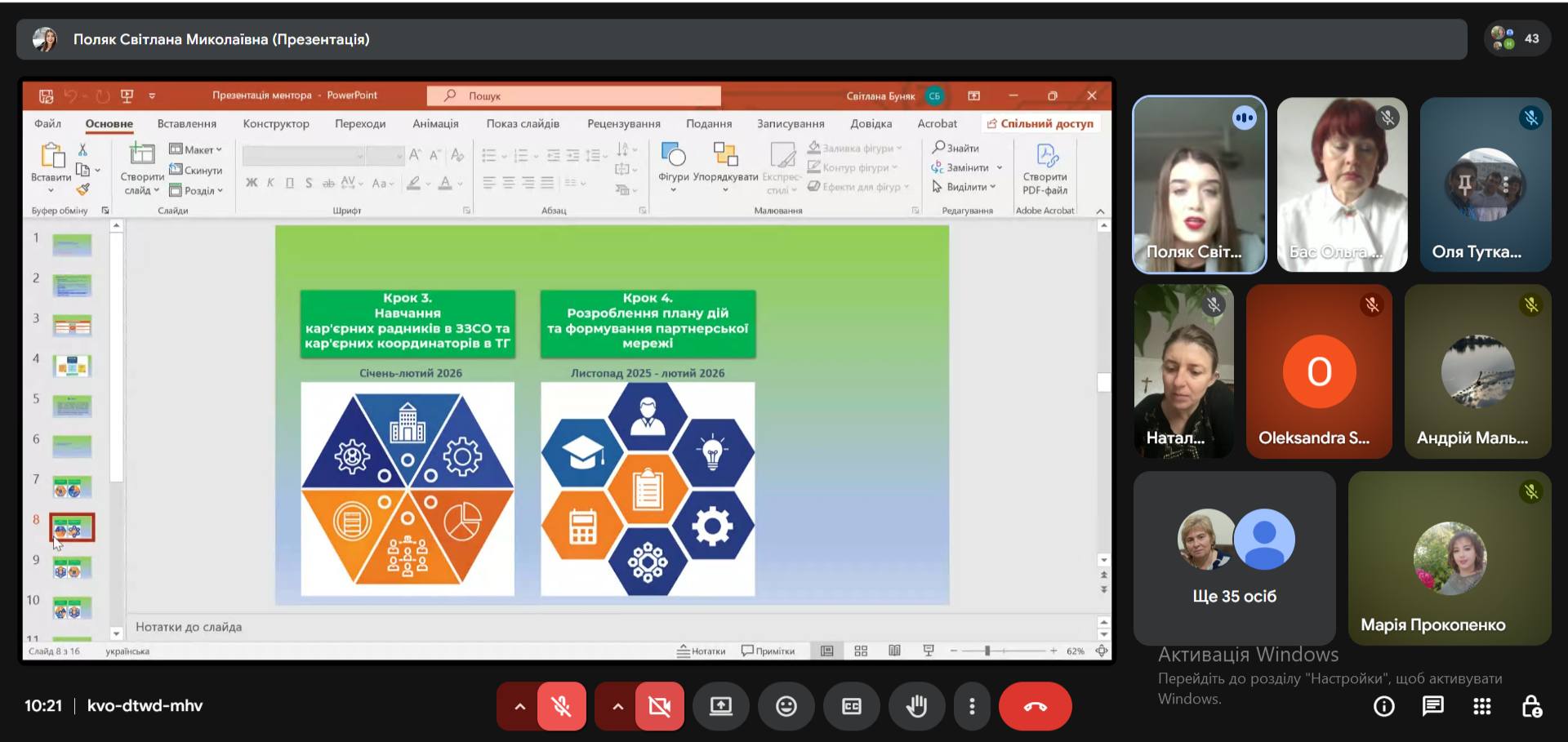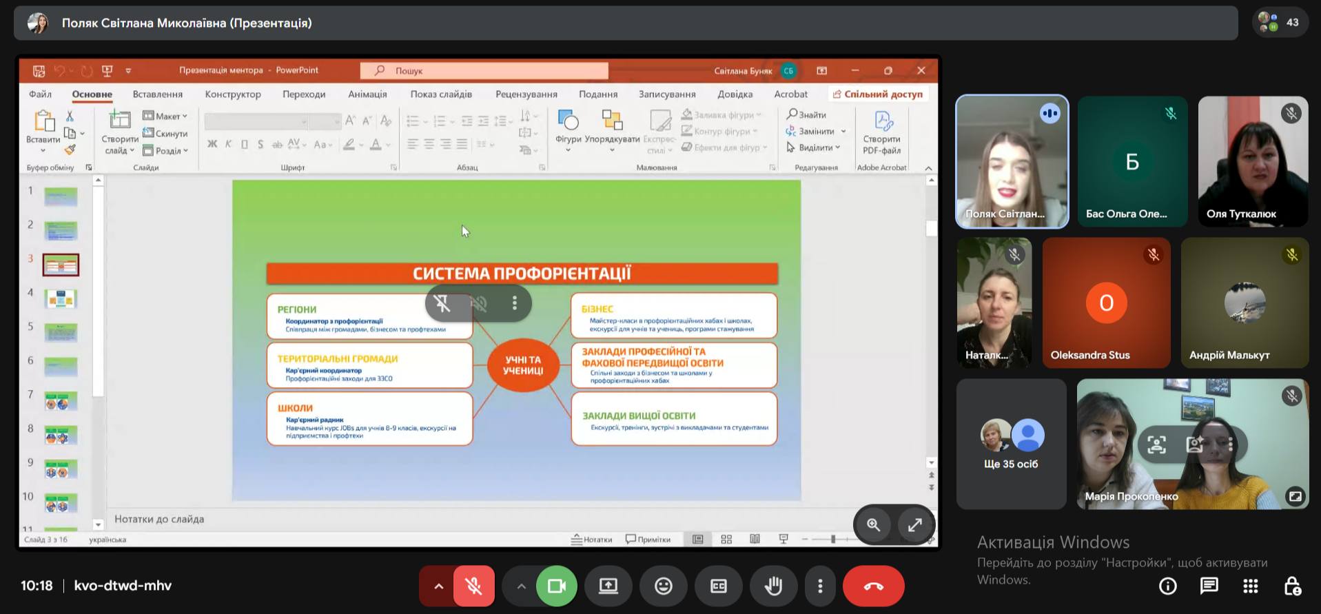 Ментори проєкту від ТОКІППО Ольга Бас, Світланя Буняк – провели інтерактивне знайомство з використанням цифрових платформ та ознайомили із дорожньою картою впровадження системи профорієнтації у громаді.