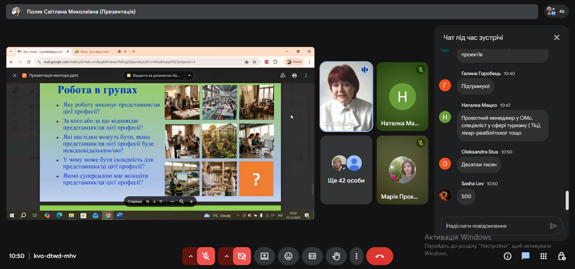На зустрічі було розглянуто огляд ключових результатів опитування учнів та учениць ЗЗСО, проведеного в межах дослідження стейкхолдерів профорієнтаційної роботи в територіальній громаді.