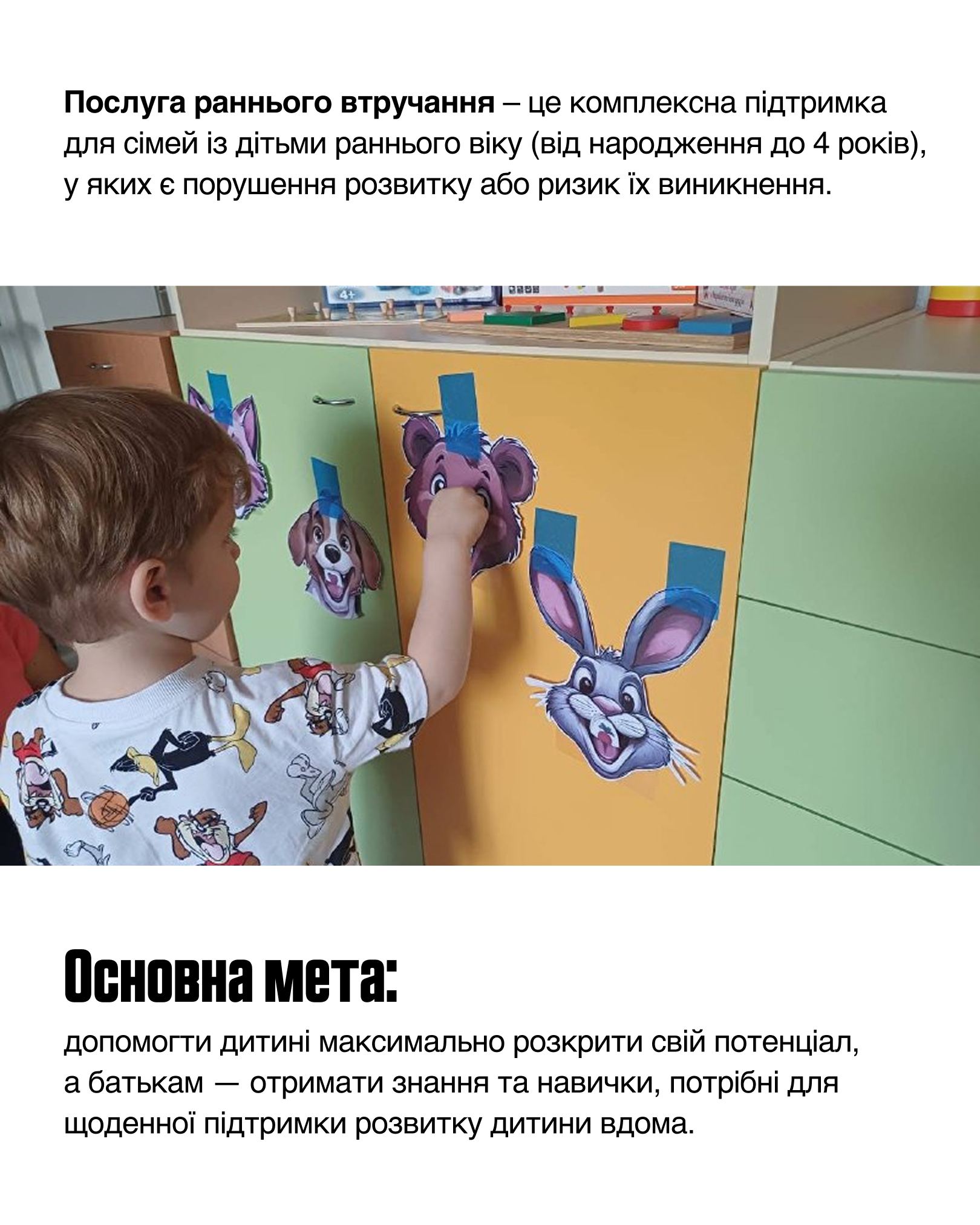 В роботі з родинами фахівці оцінюють стан дитини та разом із батьками розробляють індивідуальний сімейний план раннього втручання. Залежно від потреб дитини команда визначає ключового фахівця — психолога, фізичного терапевта або іншого спеціаліста, — який регулярно працює з сім’єю, щотижня відвідує її, аналізує досягнення дитини та визначає подальші кроки підтримки. За потреби він також пропонує нові методи й підходи для подолання труднощів.