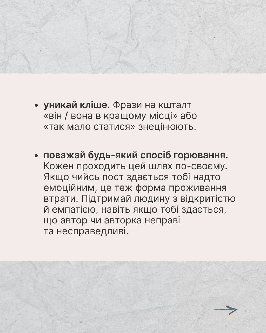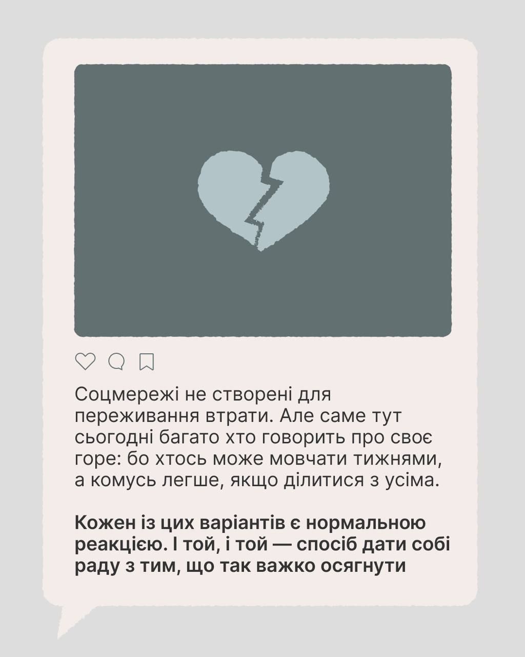 У час, коли ми бачимо в онлайні багато новин і горя, варто собі нагадувати: чужа втрата — не контент. Це не те що ми маємо обговорювати, оцінювати чи сприймати як запрошення зайти в коментарі.