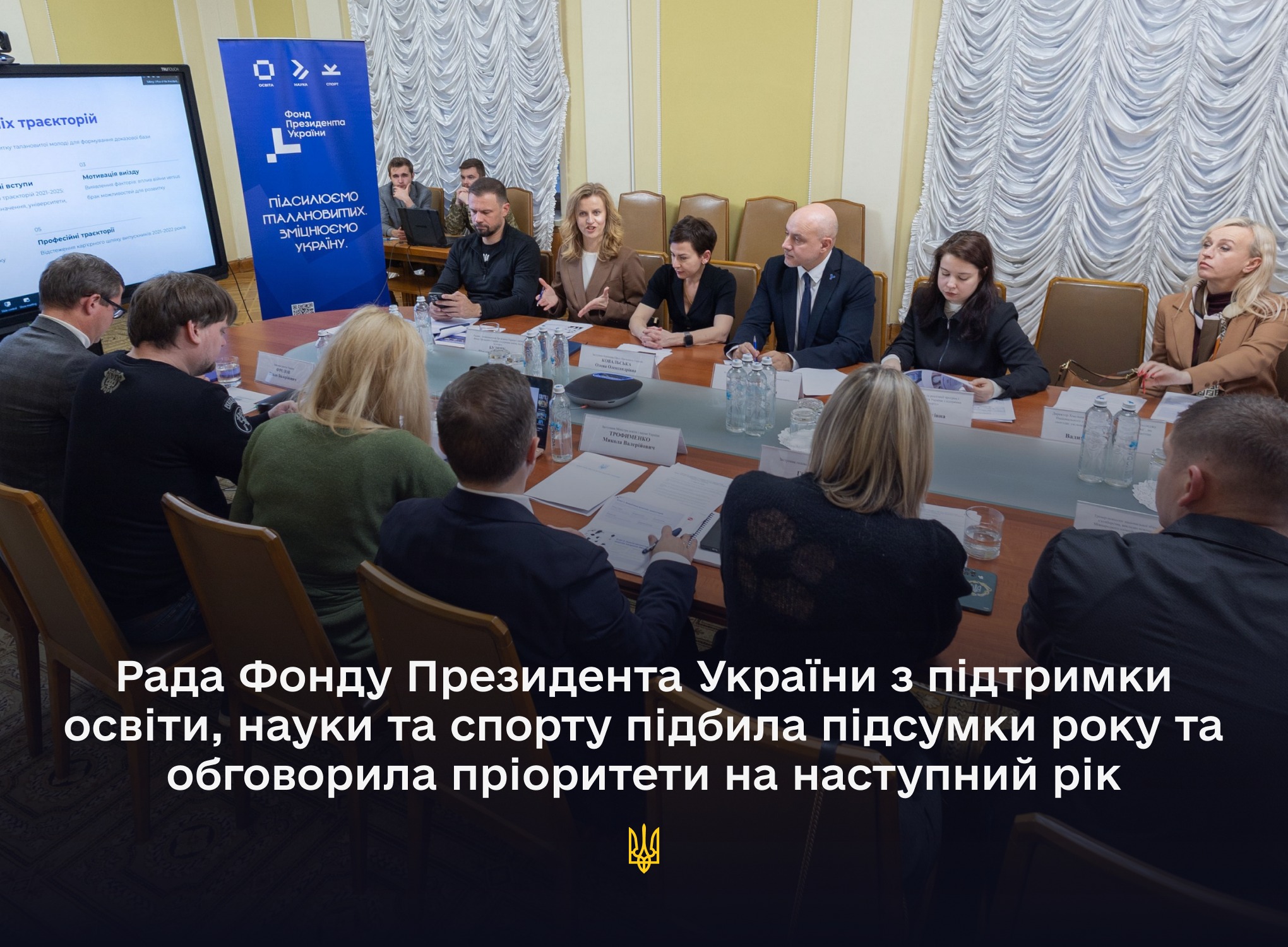 У 2025 році Фонд Президента України з підтримки освіти, науки та спорту продовжував працювати над розвитком людського капіталу, підтримкою інтелектуально обдарованої, талановитої та креативної молоді, а також молодих українців та українок, що мають вагомі досягнення у спорті.