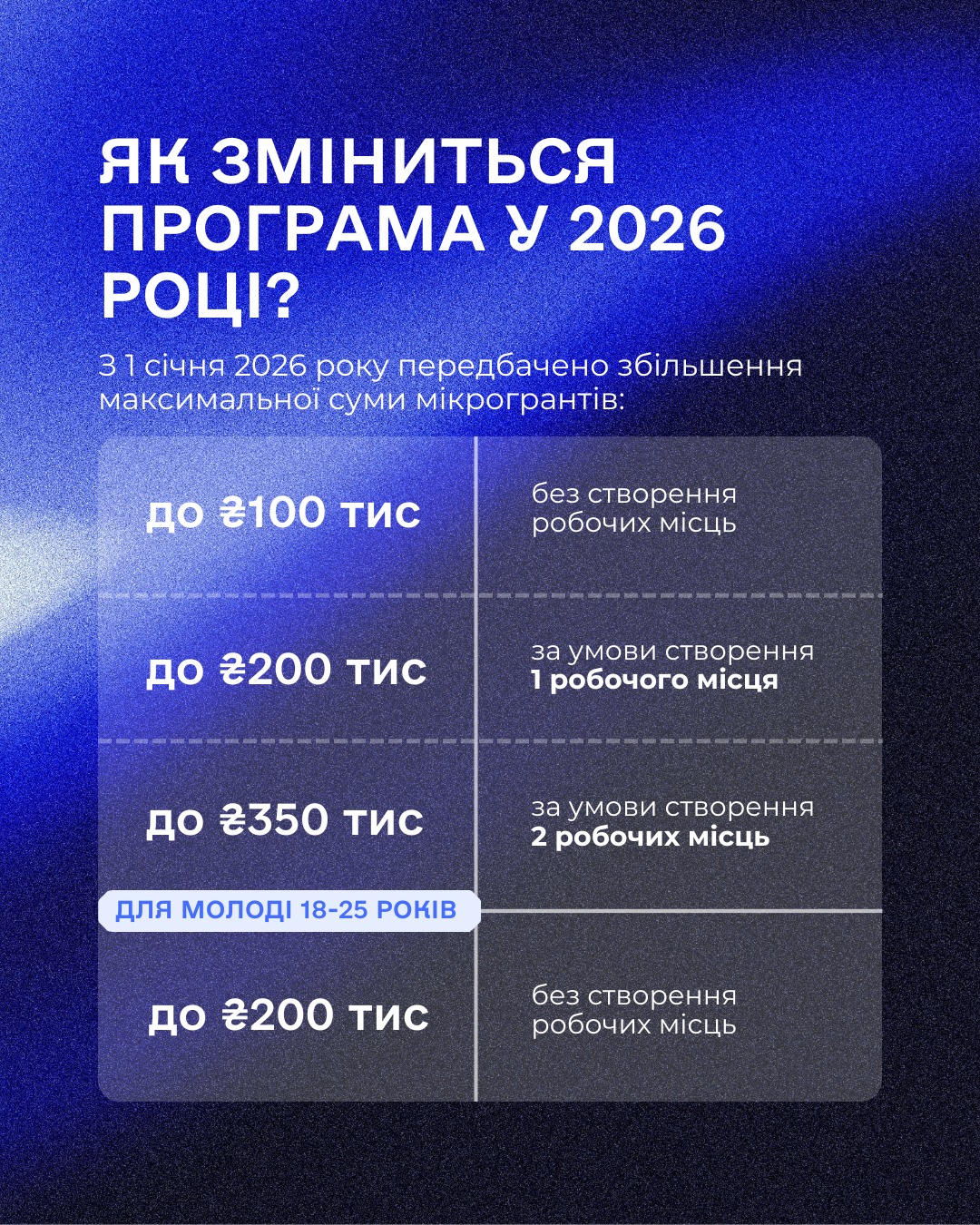 – до 200 тисяч гривень для молоді 18-25 років без додаткових умов створення робочих місць.