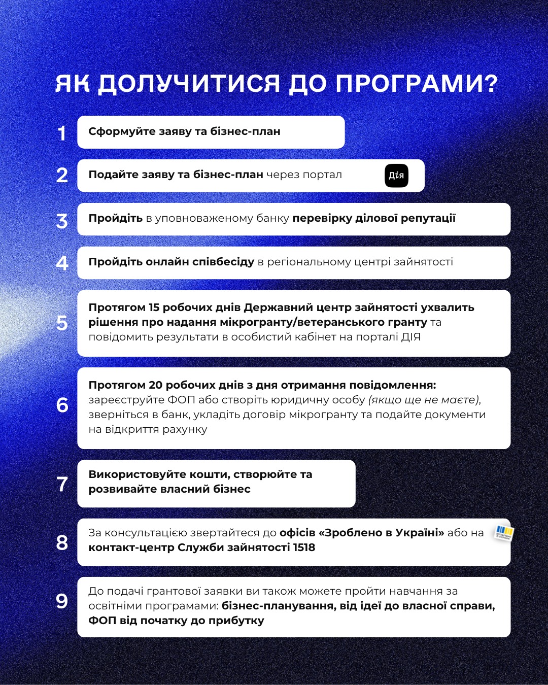 Дізнатися всі деталі програми можна на сайті Служби зайнятості, порталі Дія або звернутися в один із 100 офісів «Зроблено в Україні», де проконсультують щодо умов та допоможуть із формуванням бізнес-плану. До подачі грантової заявки ви також можете безоплатно пройти навчання за освітніми програмами: бізнес-планування, від ідеї до власної справи, ФОП від початку до прибутку.