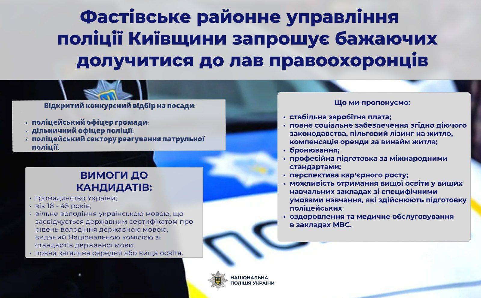 Фастівське районне управління поліції в Київській області запрошує бажаючих долучитися до лав правоохоронців
