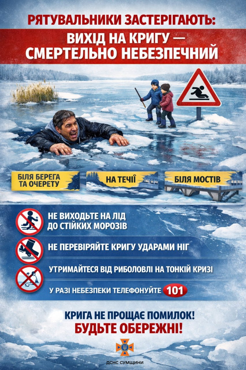 ⚠️ Особливу стурбованість викликає поведінка дітей та підлітків, які виходять на замерзлі водойми заради розваг. Такі ігри можуть мати трагічні наслідки.