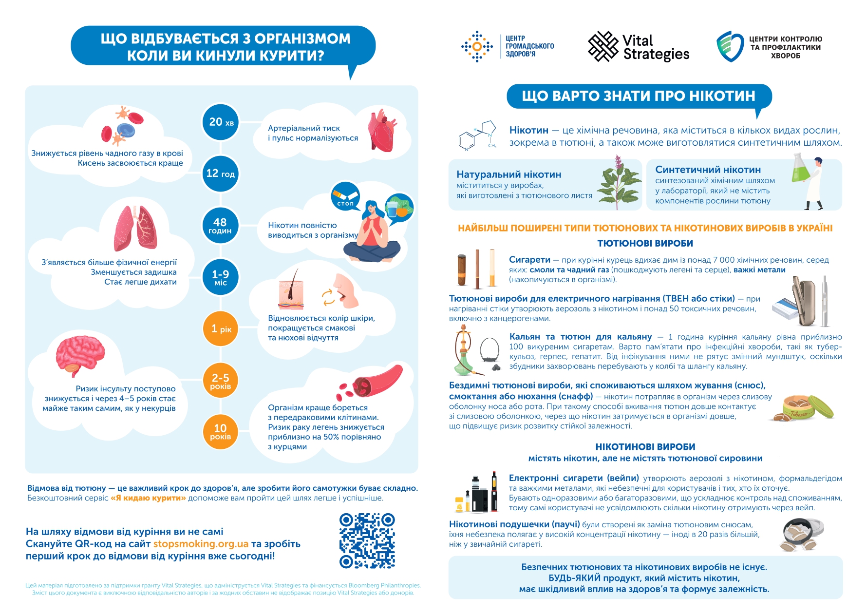 Крім цього, Центром також розроблено плакат «Що відбувається з організмом, коли ви курите» та ліфлет «Що варто знати про нікотин» (на фото).