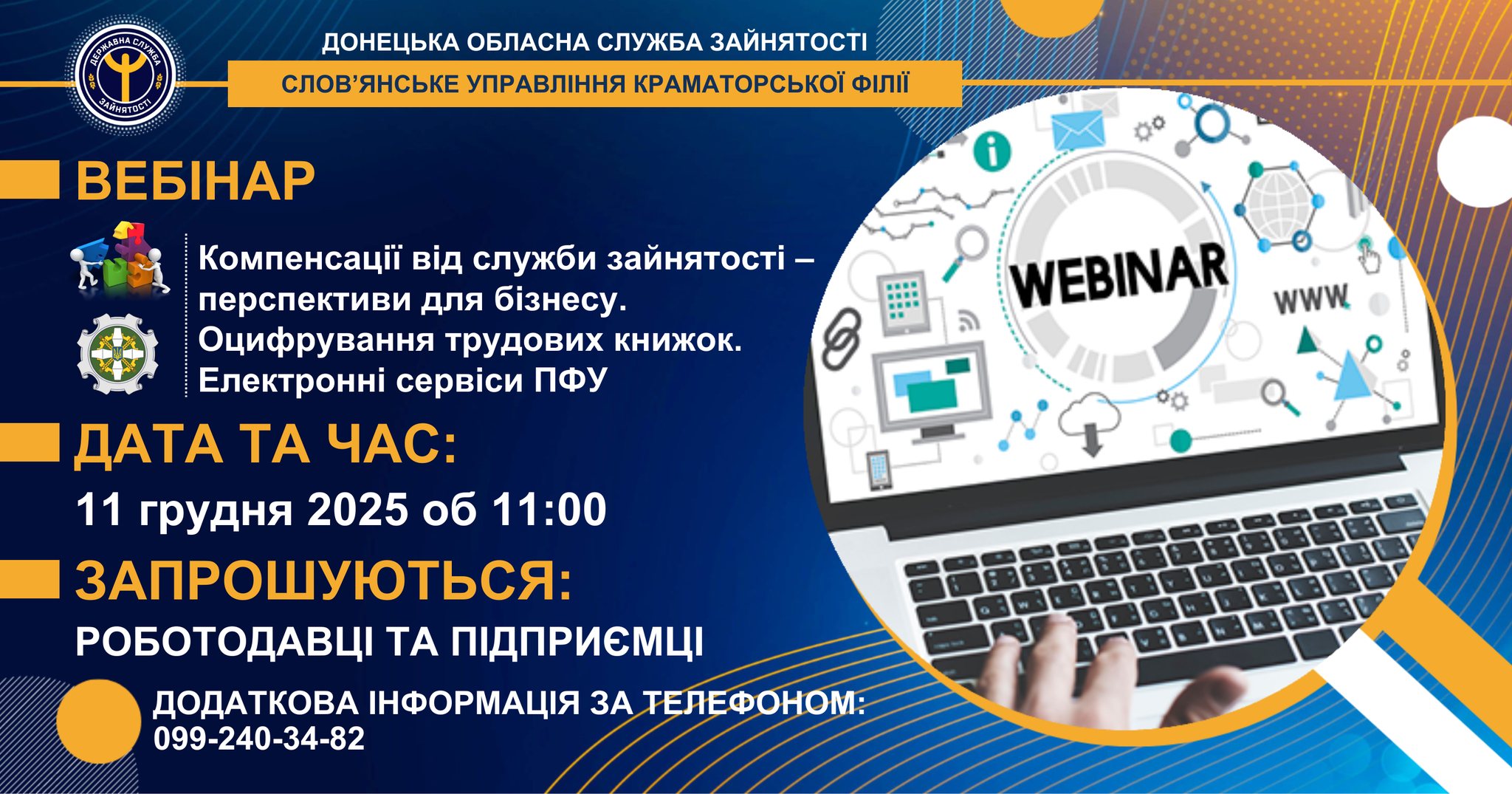 Фахівці Слов’янського управління Краматорської філії Донецького обласного центру зайнятості в рамках роботи консалтингового простору «Перспектива» запрошують роботодавців та фізичних осіб-підприємців на вебінар «Компенсації від служби зайнятості – перспективи для бізнесу. Оцифрування трудових книжок. Електронні сервіси ПФУ» 11 грудня 2025 року об 11:00 на платформі Google Meet за участі представників Головного управління ПФУ в Донецькій області. Додаткова інформація за телефоном 099-240-34-82.