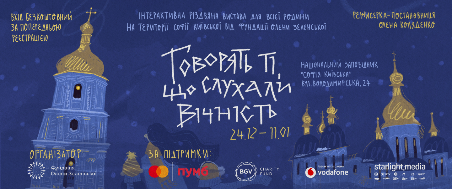 Фундація Олени Зеленської вдруге проводить інтерактивну різдвяну виставу «Говорять ті, що слухали вічність» на території Національного заповідника «Софія Київська». Про це повідомила перша леді України Олена Зеленська.
