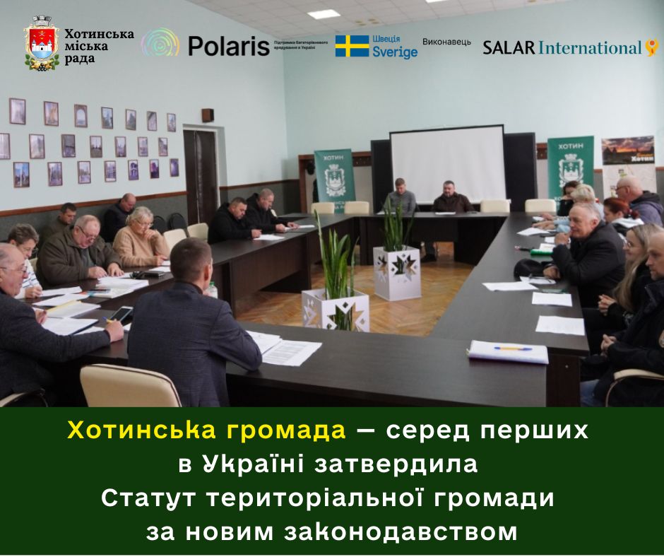 🥳 Хотинська громада стала однією з перших громад в Україні, які затвердили Статут нового зразка, розроблений із використанням методичних рекомендацій Міністерство розвитку громад та територій України, з урахуванням оновлених підходів до участі жителів та за підтримки програми Polaris «Залучення жителів на місцевому рівні: можливості розвитку», яку впроваджує SALAR International за підтримки Уряду Швеції через Sida