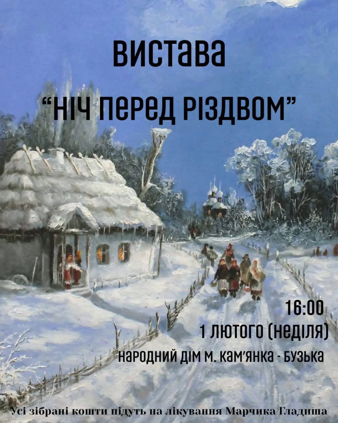 Запрошуємо вас на благодійну виставу «Ніч перед Різдвом», яка відбудеться 1 лютого (неділя) о 16:00 у Народному домі м. Кам’янка-Бузька.