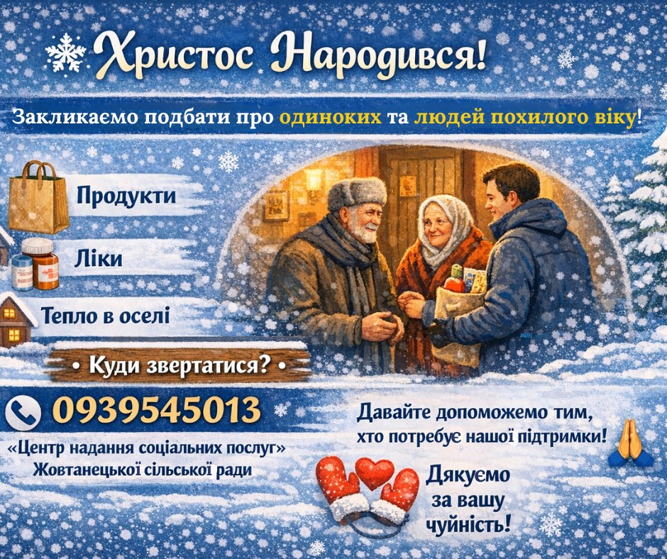 Якщо ви знаєте про одиноку людину, якій необхідна допомога, телефонуйте: 0939545013 — «Центр надання соціальних послуг» Жовтанецької сільської ради.