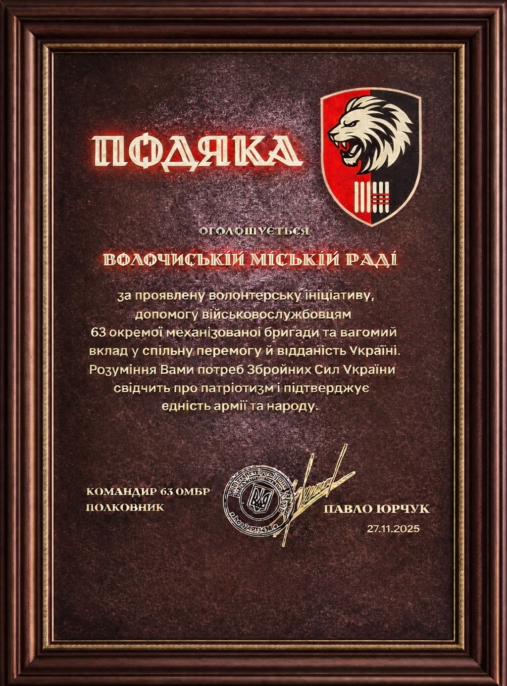 Волочиська міська рада отримала подяку за проявлену волонтерську ініціативу та допомогу військовослужбовцям 63 окремої механізованої бригади.