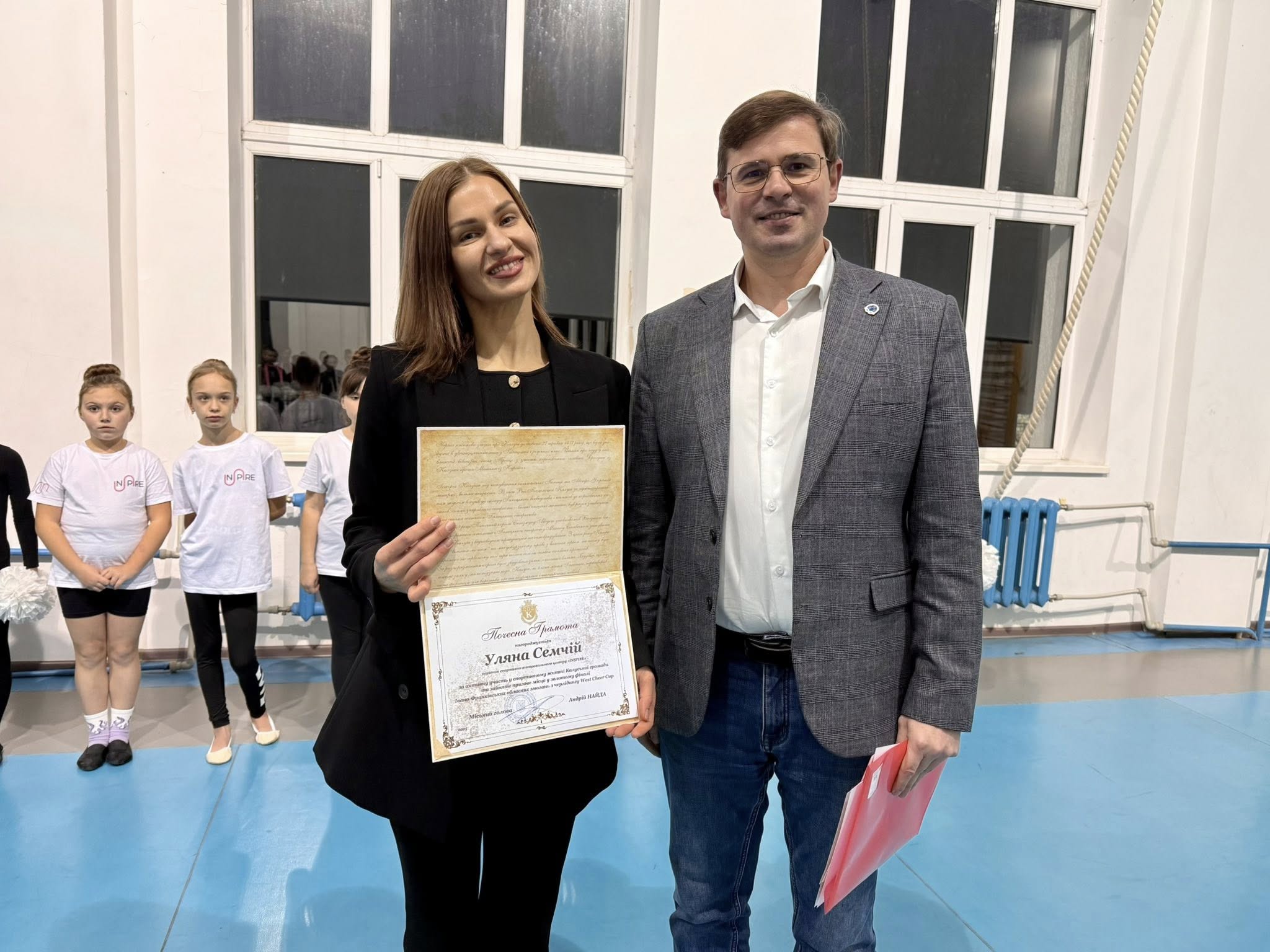 🤝🏻За активну участь у спортивному житті Калуської громади та здобуту бронзову нагороду у золотому фіналі Івано-Франківських обласних змагань з черлідингу West Cheer Cup почесними грамотами відзначив Уляну Семчій – керівницю спортивно-танцювального центру «Inspire», та Тетяну Карас – тренерку центру.