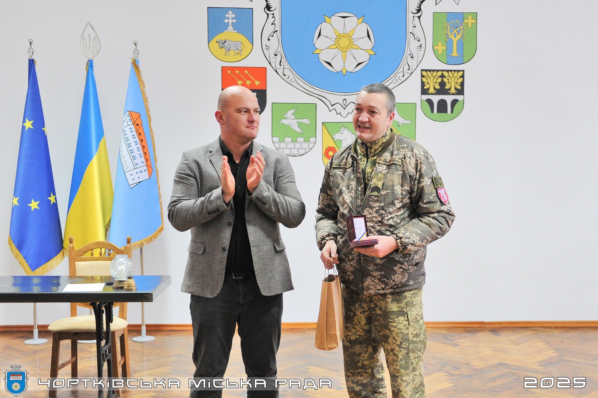 Володимир Шматько нагородив найвищою відзнакою Чортківського міського голови «За честь і відвагу» чортків’янина, сержанта, начальника групи відділення ВСП Тернопільського зонального відділу Військової служби правопорядку Віктора Андрусишина.