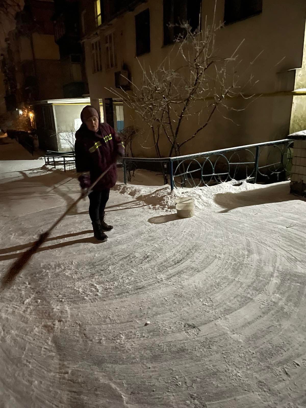 Для забезпечення належного стану прибудинкових територій житлових будинків Голосіївського району станом КП “Керуюча компанія з обслуговування Голосіївського району м. Києва” 224 робітників з комплексного прибирання будинків та 9 одиниць техніки. Використовується піско-соляна суміш і сіль.