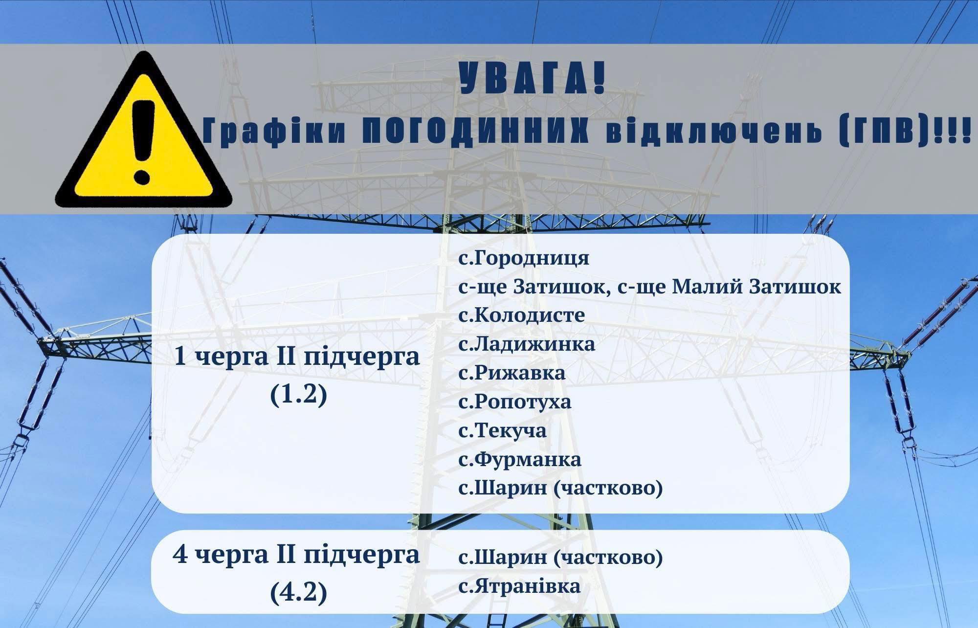 Через постійні ворожі обстріли та наслідки попередніх масованих ракетно-дронових атак по Черкаській області 25 січня за командою НЕК «Укренерго» застосовуватимуться графіки погодинних вимкнень (ГПВ).