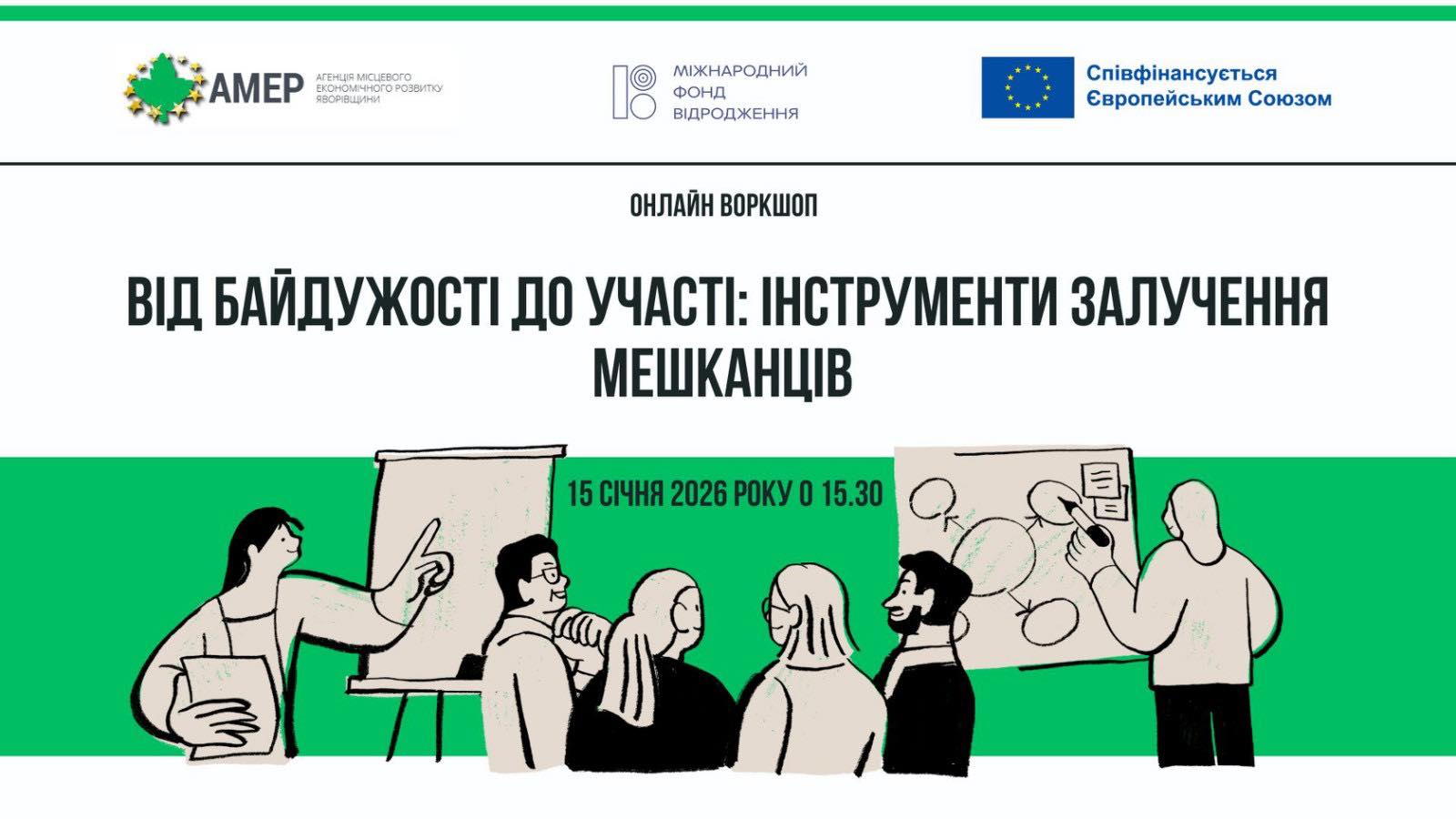 Запрошуємо 15 січня 2026 року о 15.30 на онлайн воркшоп, де говоритимемо не про теорію, а про живі приклади та практичні інструменти участі у житті громади. Разом розберемо, як перейти від позиції «мене це не стосується» до реальних дій, як залучати мешканців, об’єднувати людей навколо ідей та запускати зміни знизу.