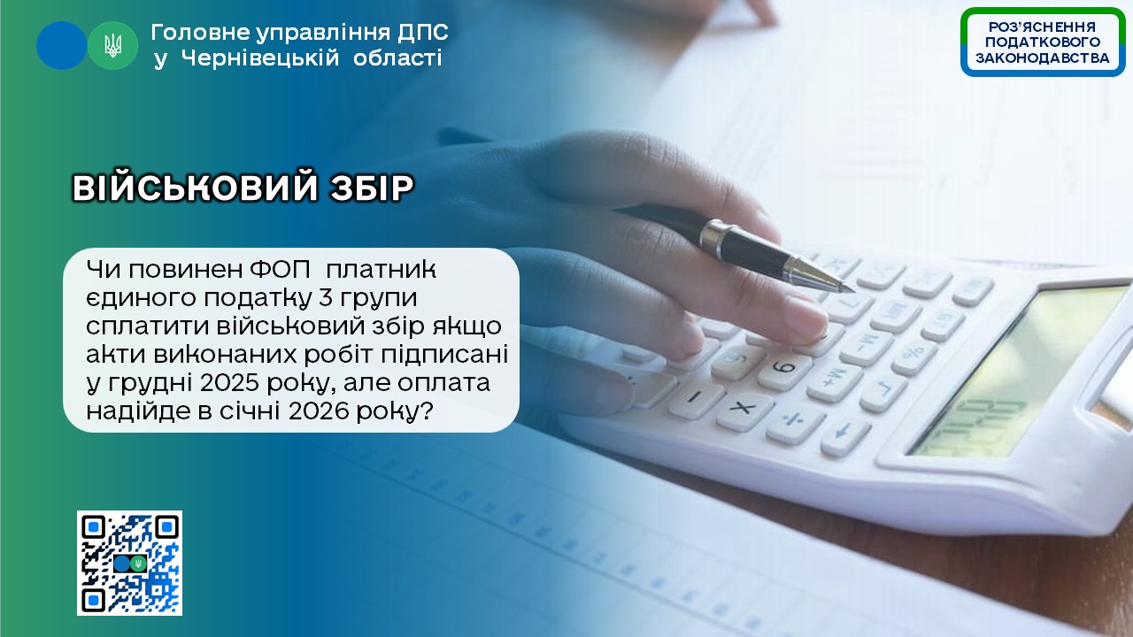 ℹ У Головному управлінні ДПС у Чернівецькій області роз’яснюють, що платники єдиного податку третьої групи є платниками військового збору, відповідно до п.п. 3 п.п. 1.1 п. 16 прим. 1 підрозд. 10 розд. XX «Перехідні положення» Податкового кодексу України від 02 грудня 2010 року № 2755-VI (далі – ПКУ). Згідно п.292.6 ПКУ дохід платників єдиного податку визначається датою зарахування коштів на розрахунковий рахунок. Тож оподаткування доходів військовим збором відбувається на дату надходження таких коштів, тобто в січні 2026 року сплата ФОП 3 групи військового збору у розмірі 1 % від доходу.