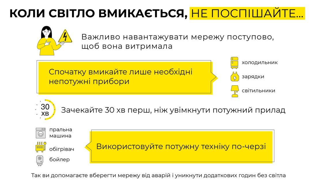 Після відновлення електропостачання вмикайте потужні електроприлади по черзі, а не всі одночасно ‒ це зменшить навантаження на мережу.