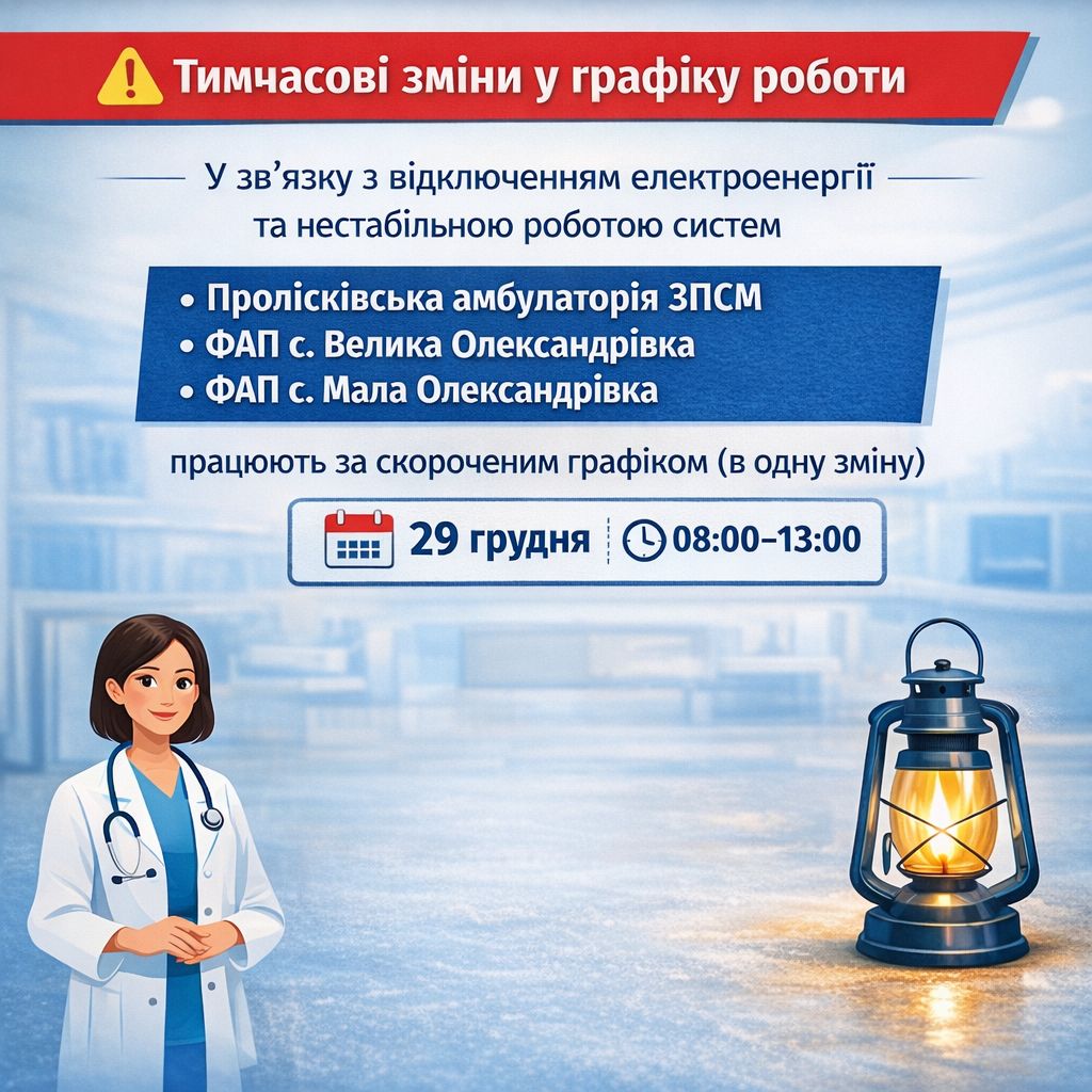 Пролісківська медична амбулаторія ЗПСМ, ФАП с. Велика Олександрівка та ФАП с. Мала Олександрівка тимчасово працюватимуть за скороченим графіком (в одну зміну).