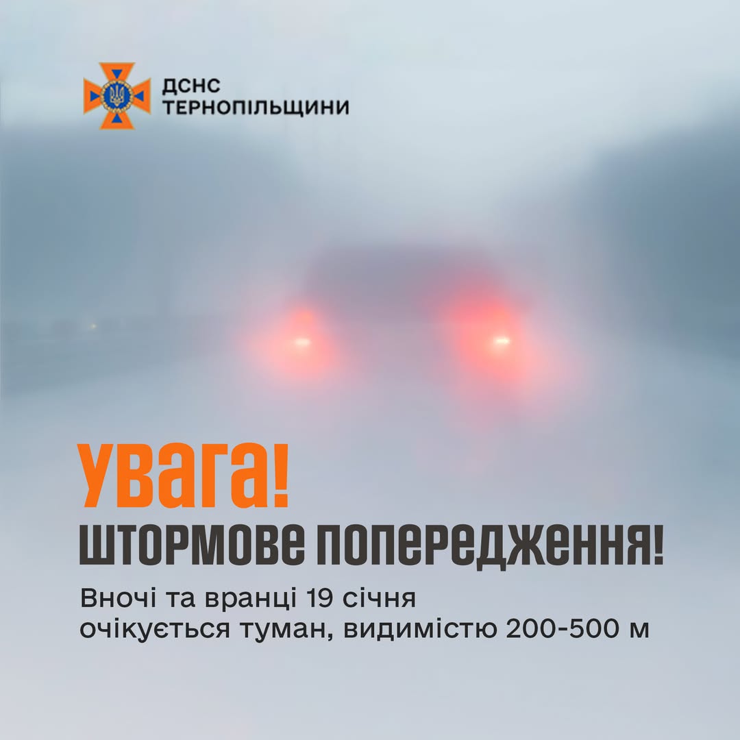 За повідомленням Тернопільського обласного центру з гідрометеорології, вночі та вранці 19 січня на території Тернопільської області очікується туман з видимістю 200–500 м.