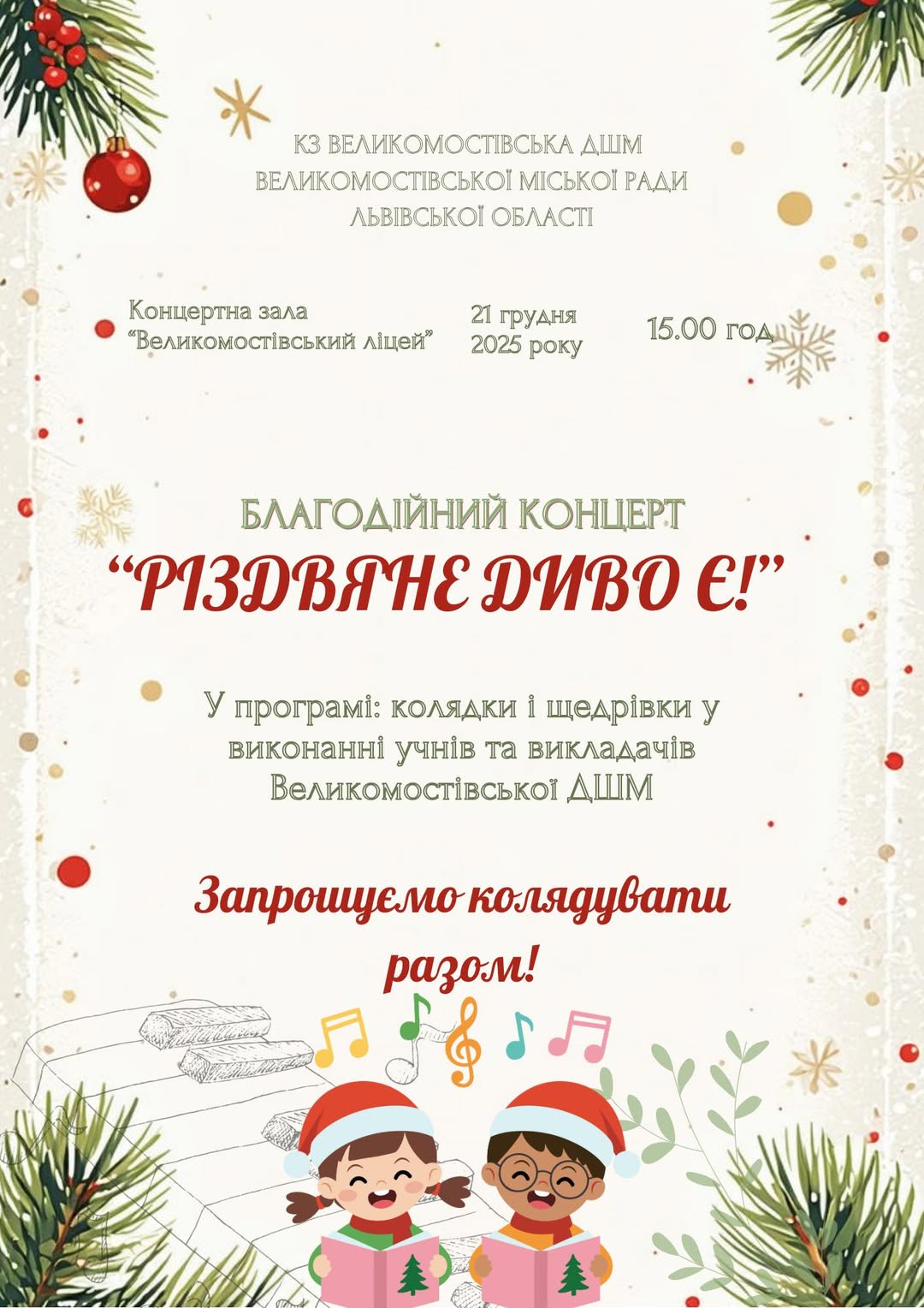 В очікуванні одного з найбільших християнських свят — Різдва Христового — щиро запрошуємо вас на благодійний концерт «Різдвяне диво є!» за участі учнів та викладачів Великомостівської дитячої школи мистецтв.